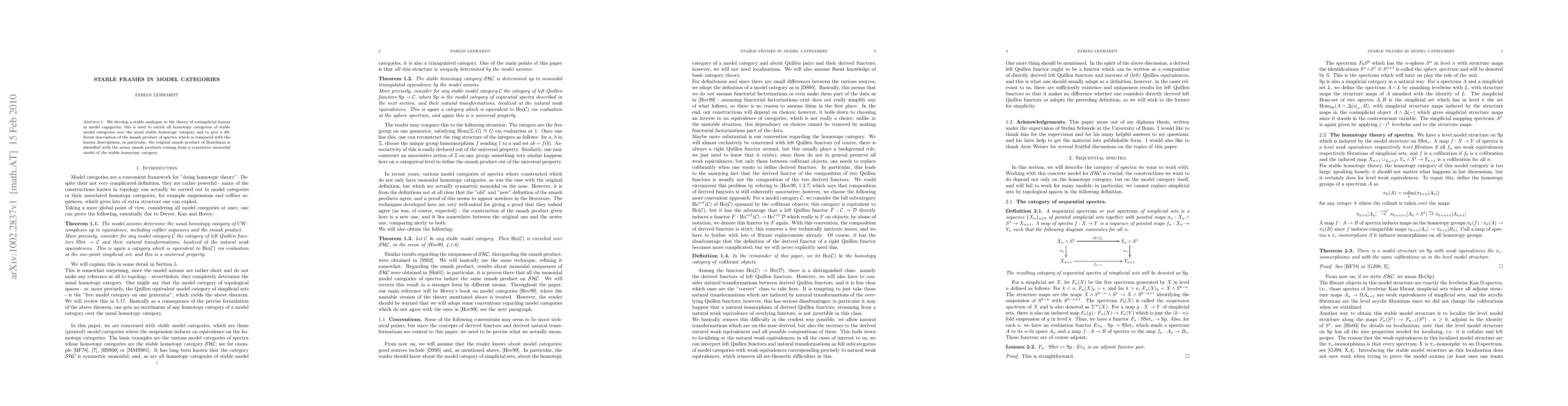 We develop a stable analogue to the theory of cosimplicial frames in model cagegories; this is used to enrich all homotopy categories of stable model categories over the usual stable homotopy category and to give a different description of the smash product of spectra which is compared with the known descriptions; in particular, the original smash product of Boardman is identified with the newer smash products coming from a symmetric monoidal model of the stable homotopy category.