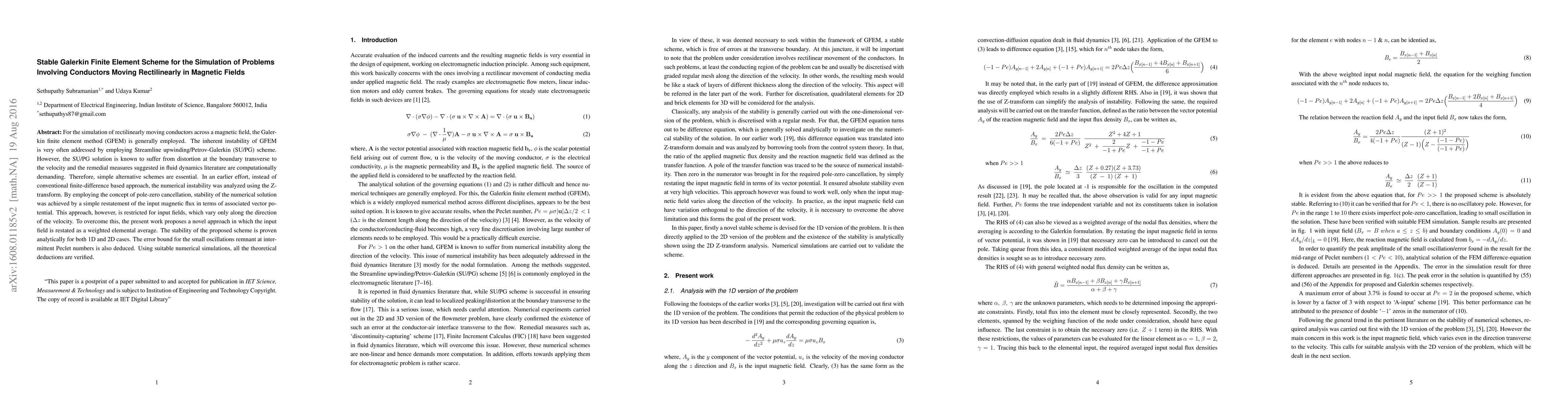 For the simulation of rectilinearly moving conductors across a magnetic field, the Galer-kin finite element method (GFEM) is generally employed. The inherent instability of GFEM is very often addressed by employing Streamline upwinding/Petrov-Galerkin (SU/PG) scheme. However, the SU/PG solution is known to suffer from distortion at the boundary transverse to the velocity and the remedial measures suggested in fluid dynamics literature are computationally demanding. Therefore, simple alternative schemes are essential. In an earlier effort, instead of conventional finite-difference based approach, the numerical instability was analyzed using the Z-transform. By employing the concept of pole-zero cancellation, stability of the numerical solution was achieved by a simple restatement of the input magnetic flux in terms of associated vector potential. This approach, however, is restricted for input fields, which vary only along the direction of the velocity. To overcome this, the present work proposes a novel approach in which the input field is restated as a weighted elemental average. The stability of the proposed scheme is proven analytically for both 1D and 2D cases. The error bound for the small oscillations remnant at intermittent Peclet numbers is also deduced. Using suitable numerical simulations, all the theoretical deductions are verified.