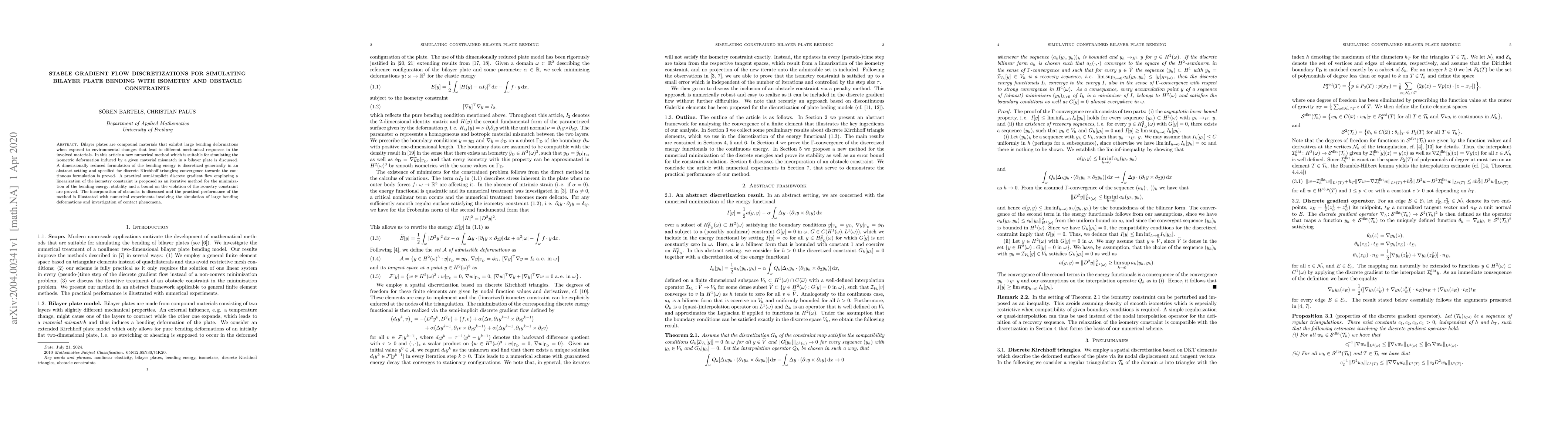 A new numerical method is introduced for simulating bilayer plate bending with constraints, which includes a semi-implicit discrete gradient flow to minimize bending energy and an isometry constraint.