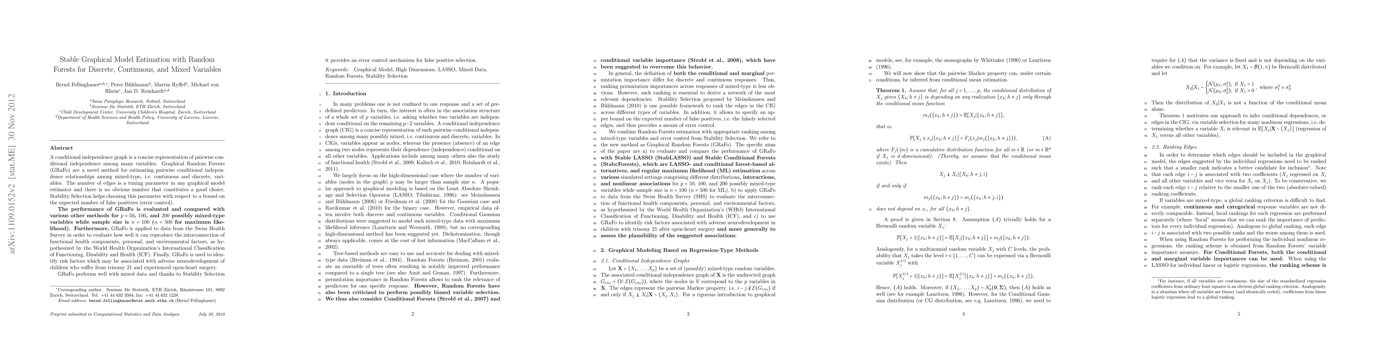 A conditional independence graph is a concise representation of pairwise conditional independence among many variables. Graphical Random Forests (GRaFo) are a novel method for estimating pairwise conditional independence relationships among mixed-type, i.e. continuous and discrete, variables. The number of edges is a tuning parameter in any graphical model estimator and there is no obvious number that constitutes a good choice. Stability Selection helps choosing this parameter with respect to a bound on the expected number of false positives (error control). The performance of GRaFo is evaluated and compared with various other methods for p = 50, 100, and 200 possibly mixed-type variables while sample size is n = 100 (n = 500 for maximum likelihood). Furthermore, GRaFo is applied to data from the Swiss Health Survey in order to evaluate how well it can reproduce the interconnection of functional health components, personal, and environmental factors, as hypothesized by the World Health Organization's International Classification of Functioning, Disability and Health (ICF). Finally, GRaFo is used to identify risk factors which may be associated with adverse neurodevelopment of children who suffer from trisomy 21 and experienced open-heart surgery. GRaFo performs well with mixed data and thanks to Stability Selection it provides an error control mechanism for false positive selection.