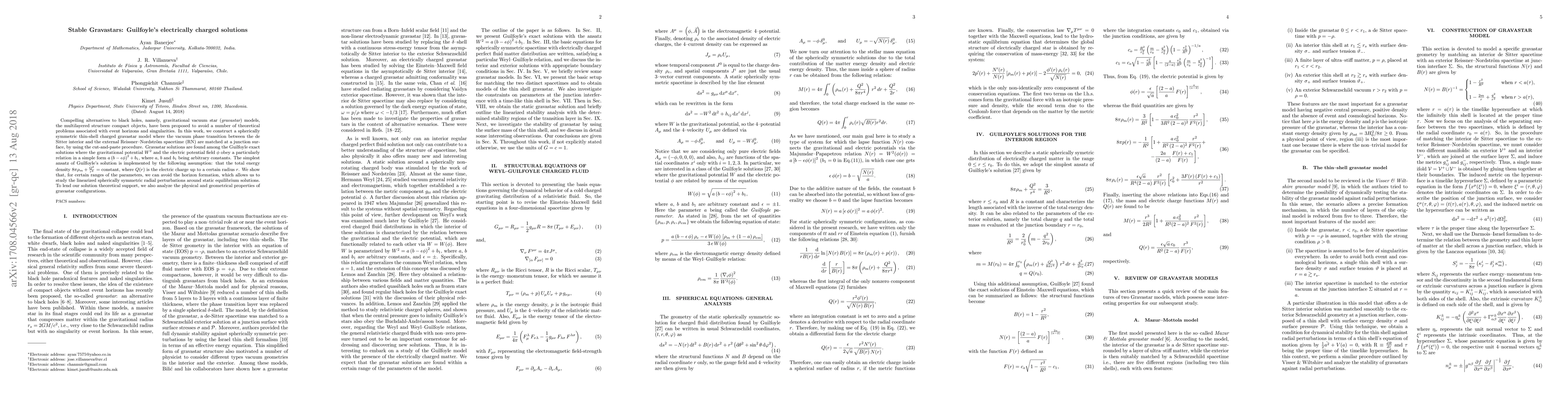 Compelling alternatives to black holes, namely, gravitational vacuum star ({\it gravastar}) models, the multilayered structure compact objects, have been proposed to avoid a number of theoretical problems associated with event horizons and singularities. In this work, we construct a spherically symmetric thin-shell charged gravastar model where the vacuum phase transition between the de Sitter interior and the external Reissner--Nordstr$\ddot{\text{o}}$m spacetime (RN) are matched at a junction surface, by using the cut-and-paste procedure. Gravastar solutions are found among the Guilfoyle exact solutions where the gravitational potential $W^2$ and the electric potential field $\phi$ obey a particularly relation in a simple form $ a\left(b-\epsilon \phi \right)^2 +b_1$, where $a$, $b$ and $b_1$ being arbitrary constants. The simplest ansatz of Guilfoyle's solution is implemented by the following assumption: that the total energy density $8\pi \rho_m+\frac{Q^2}{ r^4}$ = constant, where $Q(r)$ is the electric charge up to a certain radius $r$. We show that, for certain ranges of the parameters, we can avoid the horizon formation, which allows us to study the linearized spherically symmetric radial perturbations around static equilibrium solutions. To lend our solution theoretical support, we also analyze the physical and geometrical properties of gravastar configurations.