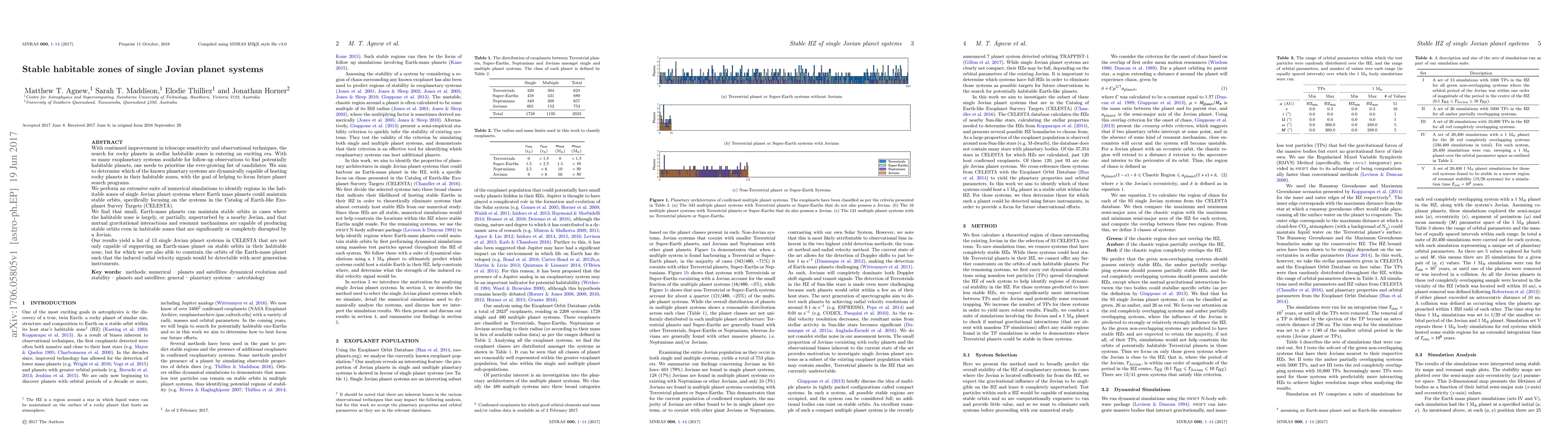 This paper identifies stable habitable zones in single Jovian planet systems using numerical simulations, focusing on the CELESTA catalog. It finds 13 systems where Earth-mass planets can maintain stable orbits, even in zones disrupted by a Jovian, and suggests these systems are prime targets for future planet search programs.