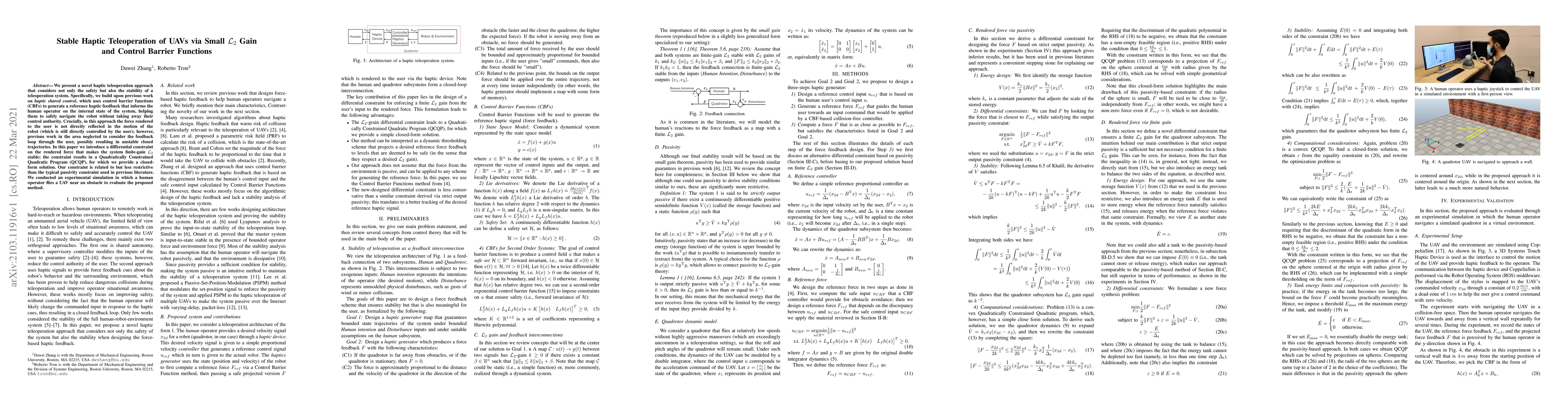 This paper proposes a novel haptic teleoperation method for UAVs that enhances stability and safety using small $L_2$ gain and control barrier functions. It introduces a differential constraint on the rendered force to achieve finite-gain $L_2$ stability, providing a closed-form solution to a Quadratically Constrained Quadratic Program (QCQP).