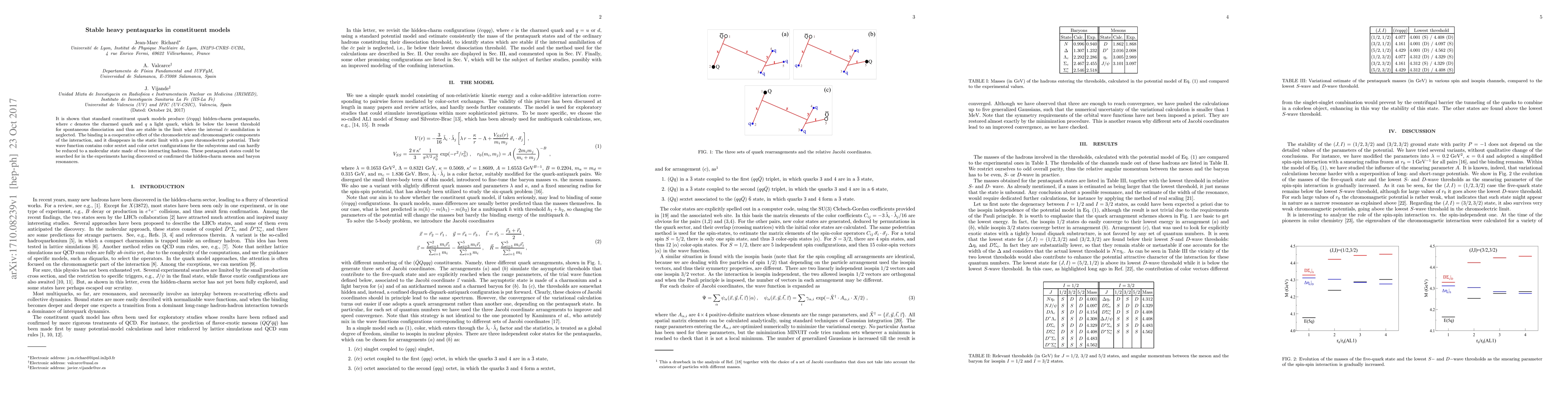 It is shown that standard constituent quark models produce $(\bar c c qqq)$ hidden-charm pentaquarks, where $c$ denotes the charmed quark and $q$ a light quark, which lie below the lowest threshold for spontaneous dissociation and thus are stable in the limit where the internal $\bar c c$ annihilation is neglected. The binding is a cooperative effect of the chromoelectric and chromomagnetic components of the interaction, and it disappears in the static limit with a pure chromoelectric potential. Their wave function contains color sextet and color octet configurations for the subsystems and can hardly be reduced to a molecular state made of two interacting hadrons. These pentaquark states could be searched for in the experiments having discovered or confirmed the hidden-charm meson and baryon resonances.