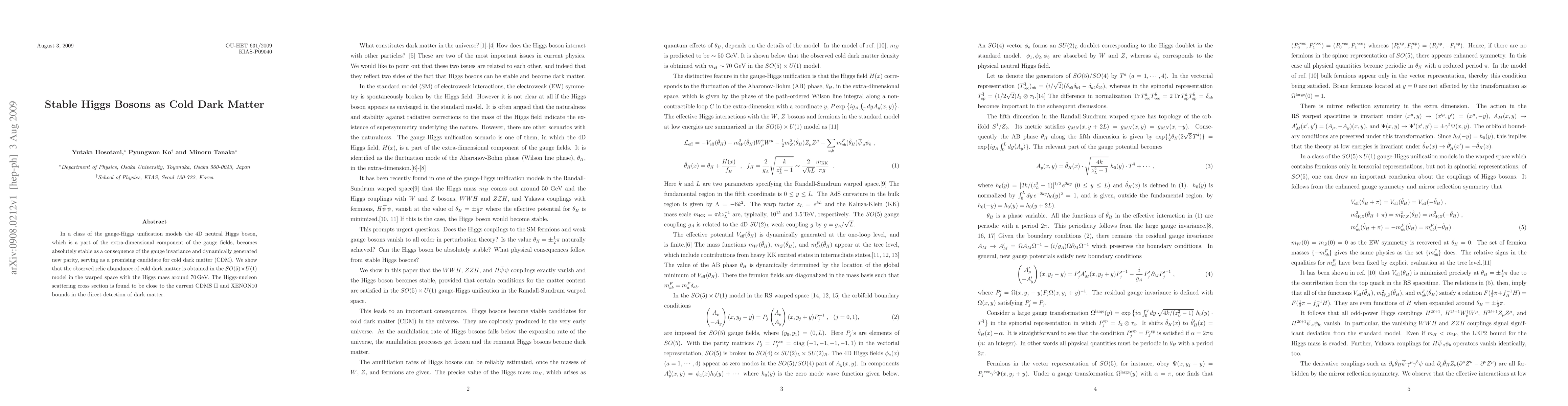 This paper proposes stable 4D neutral Higgs bosons from gauge-Higgs unification models as potential cold dark matter candidates. The SO(5) x U(1) model in warped space achieves the observed relic abundance with a Higgs mass around 70 GeV, aligning with current direct detection limits.