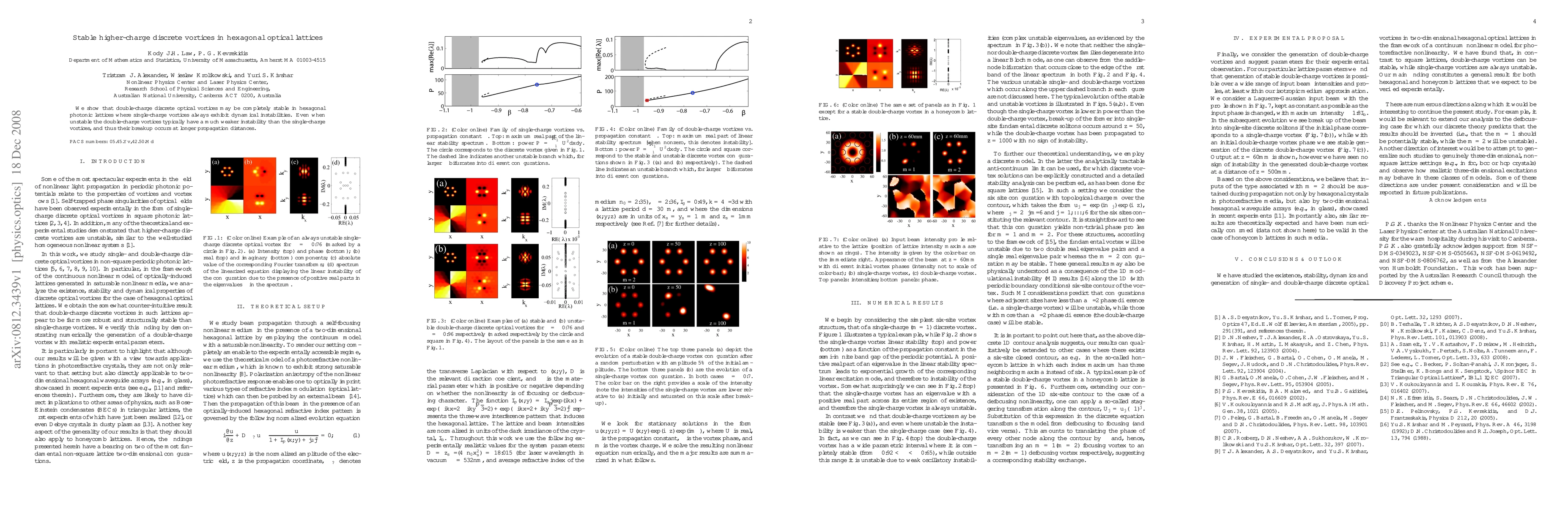 The research demonstrates the stability of double-charge discrete optical vortices in hexagonal photonic lattices, contrasting with the dynamical instabilities of single-charge vortices, and highlights that even when unstable, double-charge vortices exhibit a much weaker instability and breakup at greater distances.