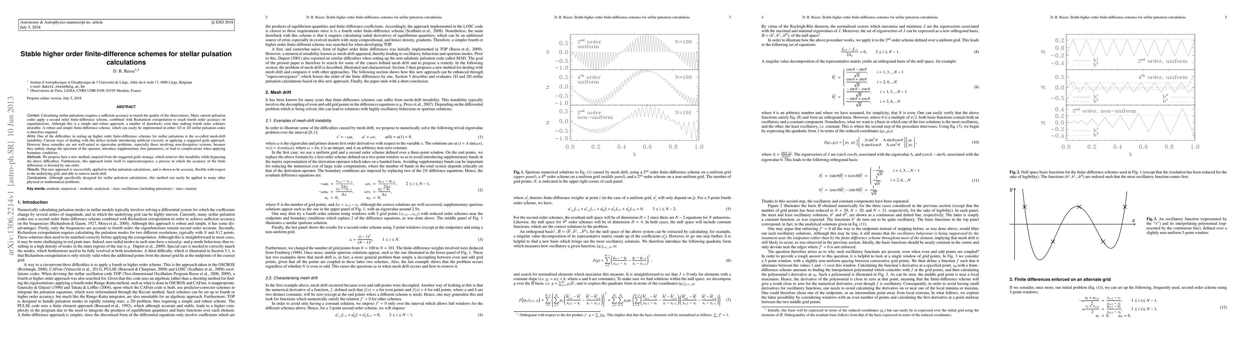 Context: Calculating stellar pulsations requires a sufficient accuracy to match the quality of the observations. Many current pulsation codes apply a second order finite-difference scheme, combined with Richardson extrapolation to reach fourth order accuracy on eigenfunctions. Although this is a simple and robust approach, a number of drawbacks exist thus making fourth order schemes desirable. A robust and simple finite-difference scheme, which can easily be implemented in either 1D or 2D stellar pulsation codes is therefore required. Aims: One of the difficulties in setting up higher order finite-difference schemes for stellar pulsations is the so-called mesh-drift instability. Current ways of dealing with this defect include introducing artificial viscosity or applying a staggered grids approach. However these remedies are not well-suited to eigenvalue problems, especially those involving non-dissipative systems, because they unduly change the spectrum of the operator, introduce supplementary free parameters, or lead to complications when applying boundary conditions. Methods: We propose here a new method, inspired from the staggered grids strategy, which removes this instability while bypassing the above difficulties. Furthermore, this approach lends itself to superconvergence, a process in which the accuracy of the finite differences is boosted by one order. Results: This new approach is shown to be accurate, flexible with respect to the underlying grid, and able to remove mesh-drift.