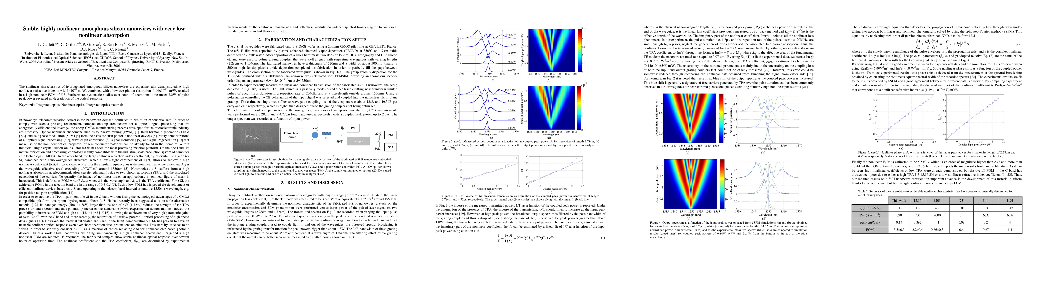 The nonlinear characteristics of hydrogenated amorphous silicon nanowires are experimentally demonstrated. A high nonlinear refractive index, n2=1.19 x 10-17 m2/W, combined with a low two-photon absorption, 0.14 x 10-11 m/W, resulted in a high nonlinear FOM of 5.5. Furthermore, systematic studies over hours of operational time under 2.2W of pulse peak power revealed no degradation of the optical response.