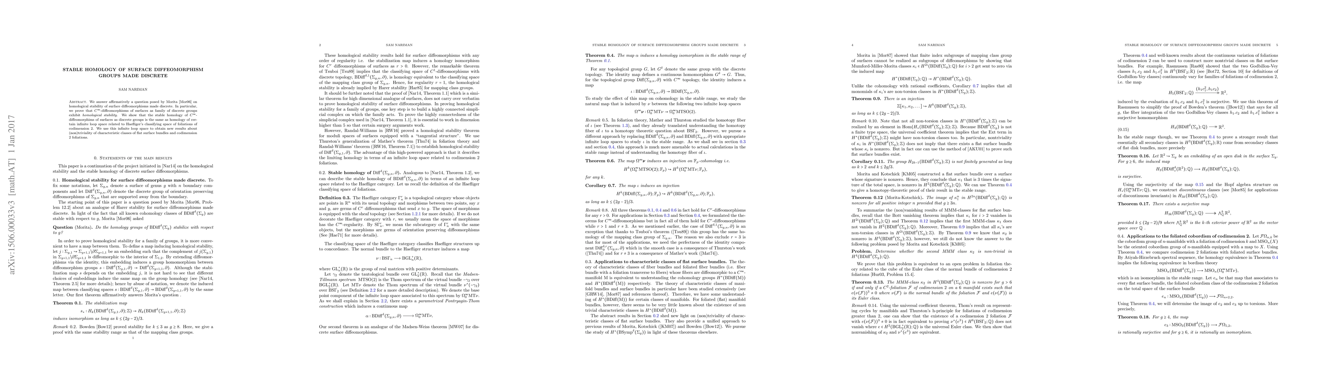 We answer affirmatively a question posed by Morita on homological stability of surface diffeomorphisms made discrete. In particular, we prove that $C^{\infty}$-diffeomorphisms and volume preserving diffeomorphisms of surfaces as family of discrete groups exhibit homological stability. We show that the stable homology of $C^{\infty}$-diffeomorphims of surfaces as discrete groups is the same as homology of certain infinite loop space related to Haefliger's classifying space of foliations of codimension 2. We use this infinite loop space to obtain new results about (non)triviality of characteristic classes of flat surface bundles.