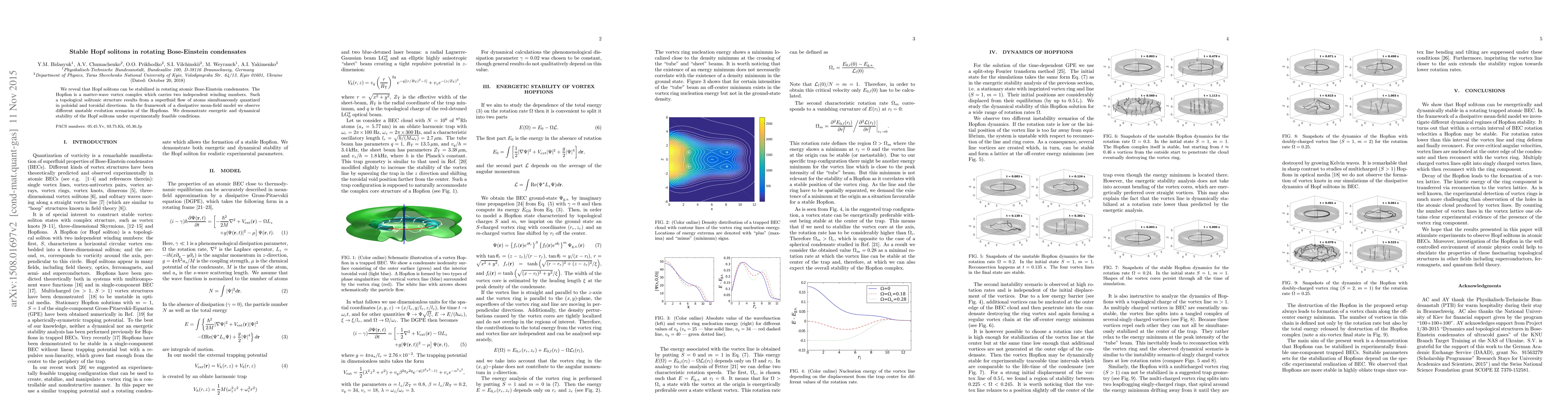The research identifies stable Hopf solitons, or Hopfions, in rotating Bose-Einstein condensates, which are matter-wave vortex complexes with two independent winding numbers. These topological solitonic structures, stable under experimentally feasible conditions, exhibit quantized superfluid flow in both poloidal and toroidal directions.
