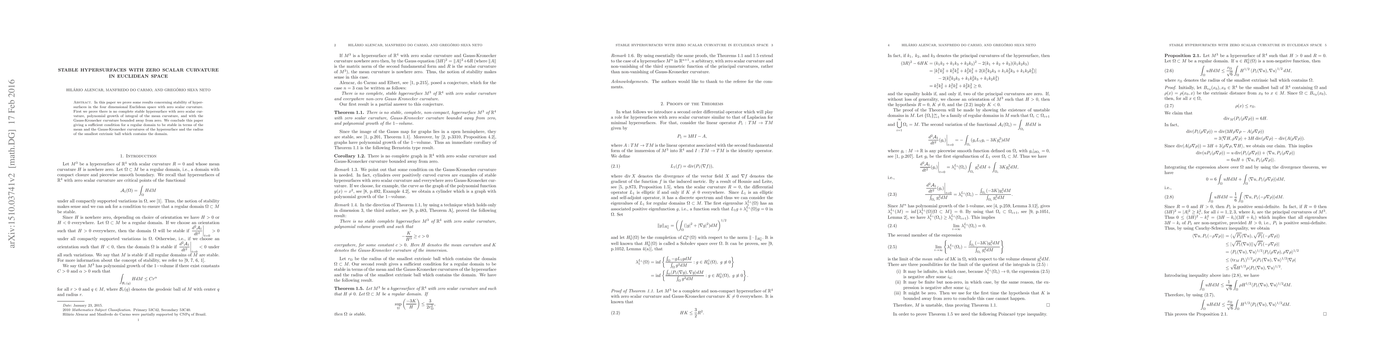 This paper proves that there are no complete stable hypersurfaces with zero scalar curvature in four-dimensional Euclidean space under specified conditions. It also provides a sufficient condition for a regular domain to be stable based on mean and Gauss-Kronecker curvatures and the radius of the smallest enclosing extrinsic ball.