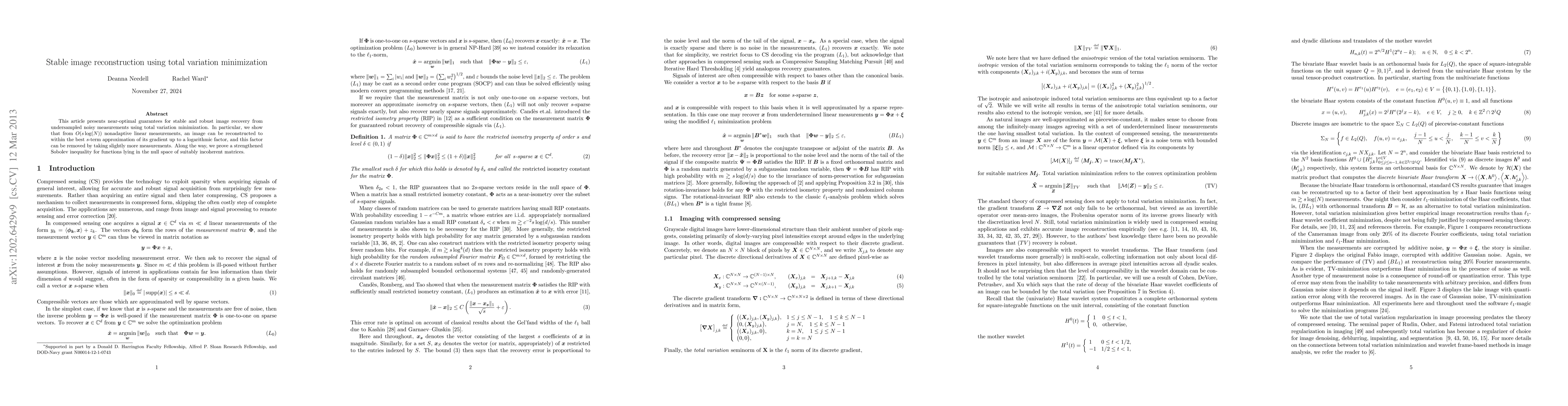 This paper provides near-optimal guarantees for robust image reconstruction using total variation minimization from under-sampled noisy measurements, demonstrating the ability to reconstruct images to within the best gradient approximation with O(slog(N)) measurements, and proves a strengthened Sobolev inequality for functions in the null space of incoherent matrices.
