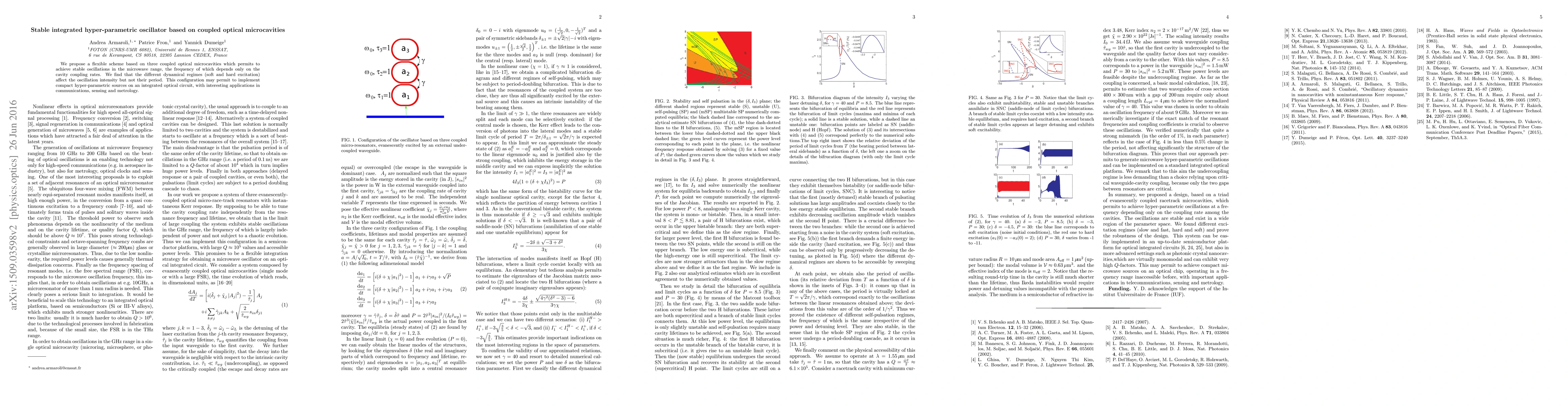 This paper proposes a stable integrated hyper-parametric oscillator using three coupled optical microcavities, achieving microwave oscillations whose frequency depends on cavity coupling rates. The study finds that while different dynamical regimes affect oscillation intensity, they do not alter the period, suggesting potential for compact, integrated hyper-parametric sources in communications, sensing, and metrology.