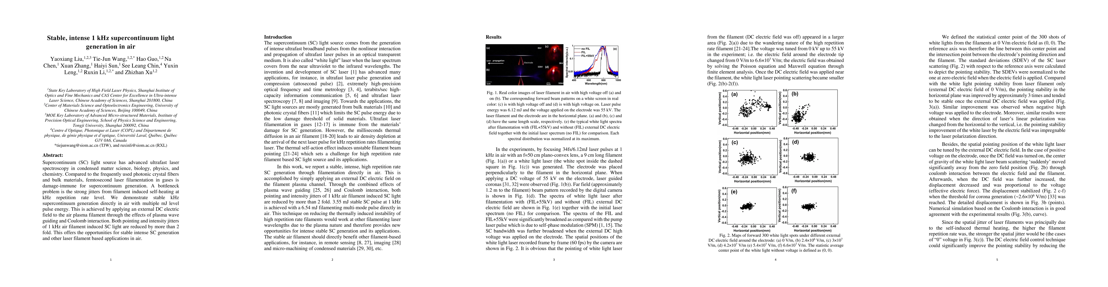 This paper demonstrates stable intense 1 kHz supercontinuum generation in air using femtosecond laser filamentation, addressing the issue of jitters from self-heating. An external DC electric field reduces both pointing and intensity jitters by more than 2 fold, enabling stable SC light for various applications.