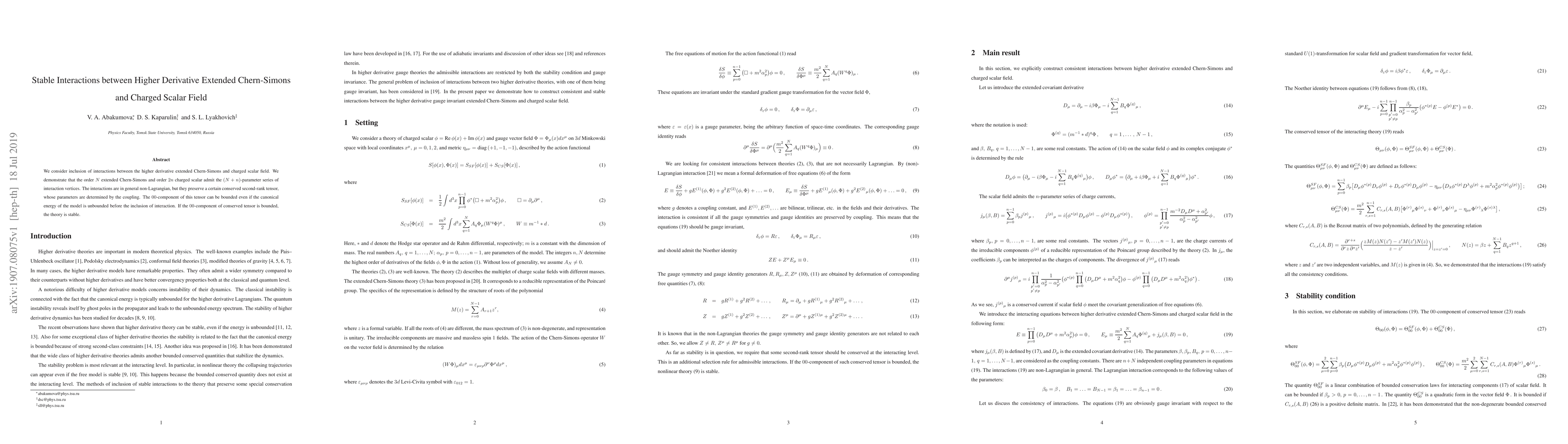 The research explores interactions between higher derivative extended Chern-Simons theory and charged scalar fields, revealing non-Lagrangian but stable interaction vertices that preserve a conserved tensor, with bounded $00$-component ensuring stability despite unbounded energy.