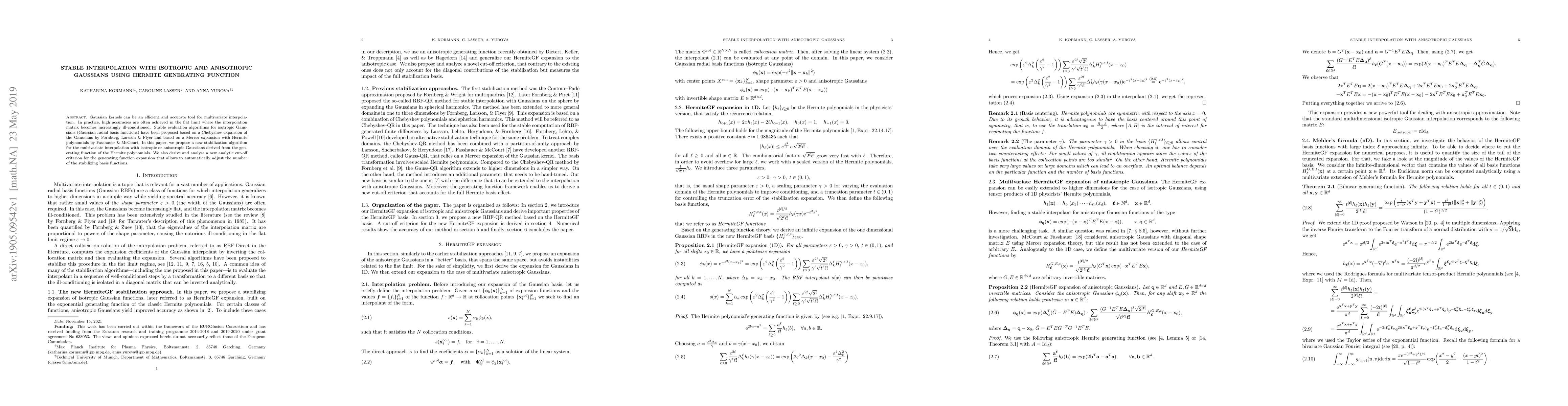 Gaussian kernels can be an efficient and accurate tool for multivariate interpolation. In practice, high accuracies are often achieved in the flat limit where the interpolation matrix becomes increasingly ill-conditioned. Stable evaluation algorithms for isotropic Gaussians (Gaussian radial basis functions) have been proposed based on a Chebyshev expansion of the Gaussians by Fornberg, Larsson & Flyer and based on a Mercer expansion with Hermite polynomials by Fasshauer & McCourt. In this paper, we propose a new stabilization algorithm for the multivariate interpolation with isotropic or anisotropic Gaussians derived from the generating function of the Hermite polynomials. We also derive and analyse a new analytic cut-off criterion for the generating function expansion that allows to automatically adjust the number of the stabilizing basis functions.