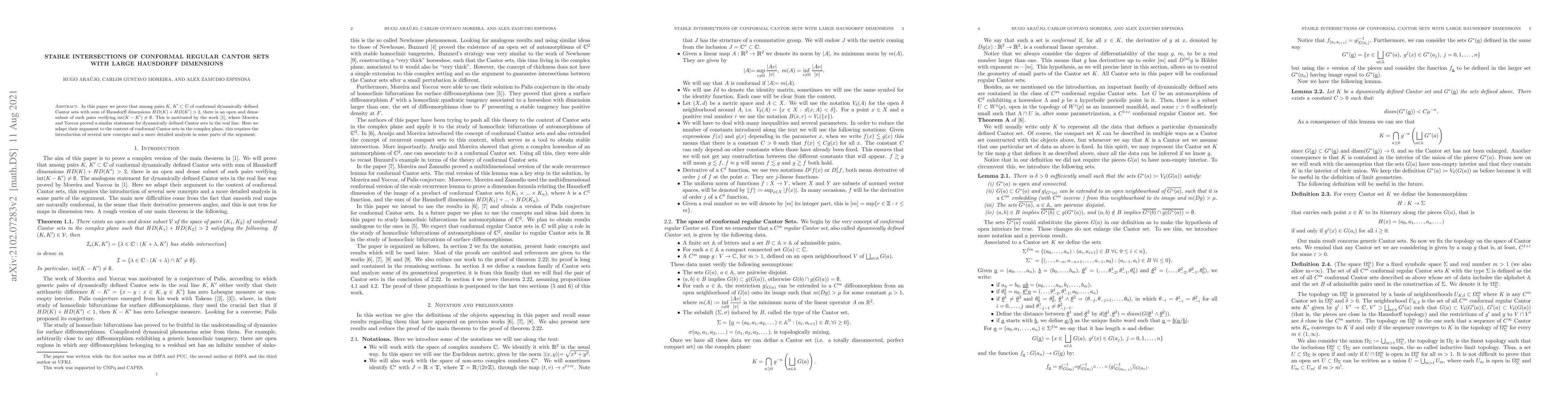 This paper proves that for pairs of conformal Cantor sets in the complex plane with combined Hausdorff dimensions greater than 2, there exists a dense open set where the interiors of the sets differ. This extends results from real-line Cantor sets by adapting new concepts and a more detailed analysis for the complex plane.