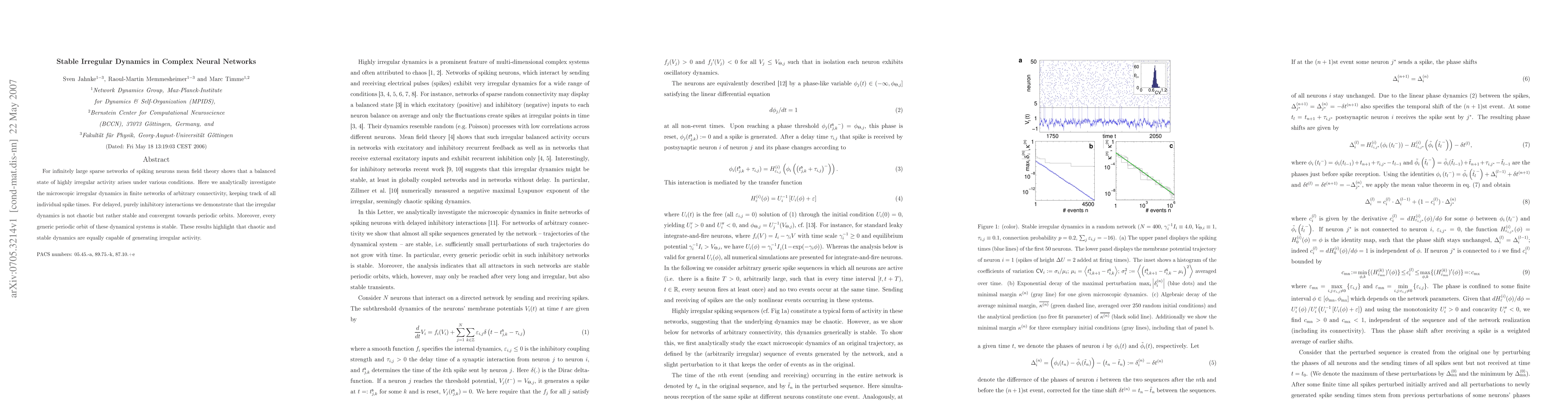 For infinitely large sparse networks of spiking neurons mean field theory shows that a balanced state of highly irregular activity arises under various conditions. Here we analytically investigate the microscopic irregular dynamics in finite networks of arbitrary connectivity, keeping track of all individual spike times. For delayed, purely inhibitory interactions we demonstrate that the irregular dynamics is not chaotic but rather stable and convergent towards periodic orbits. Moreover, every generic periodic orbit of these dynamical systems is stable. These results highlight that chaotic and stable dynamics are equally capable of generating irregular activity.