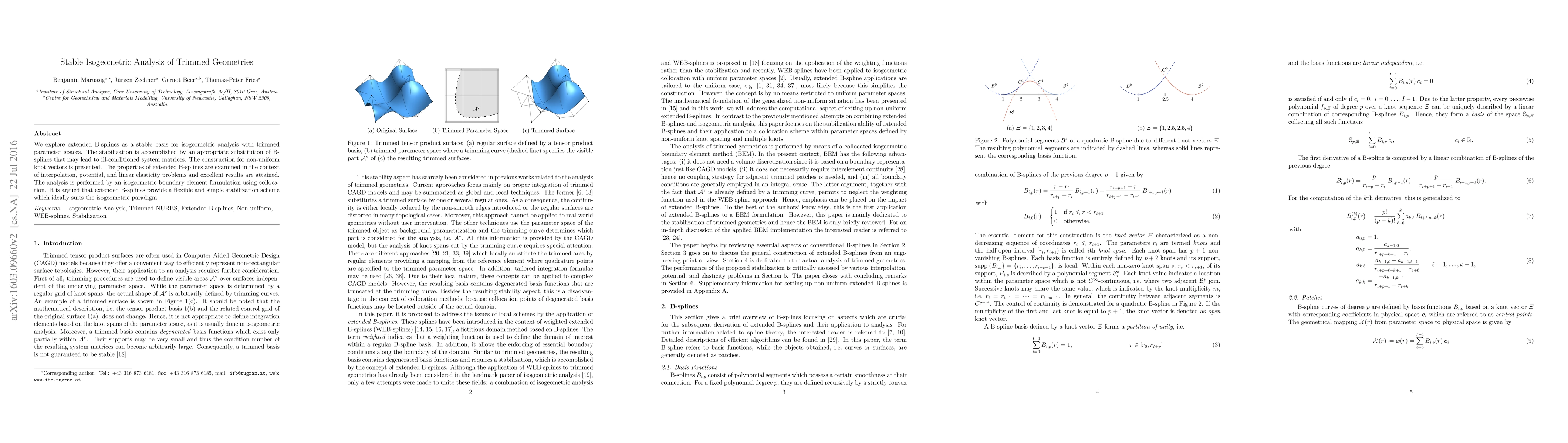 This paper investigates extended B-splines for stable isogeometric analysis of trimmed geometries, addressing ill-conditioned system matrices through appropriate B-spline substitution. The method is shown to effectively stabilize non-uniform knot vector constructions, yielding excellent results in interpolation, potential, and linear elasticity problems.