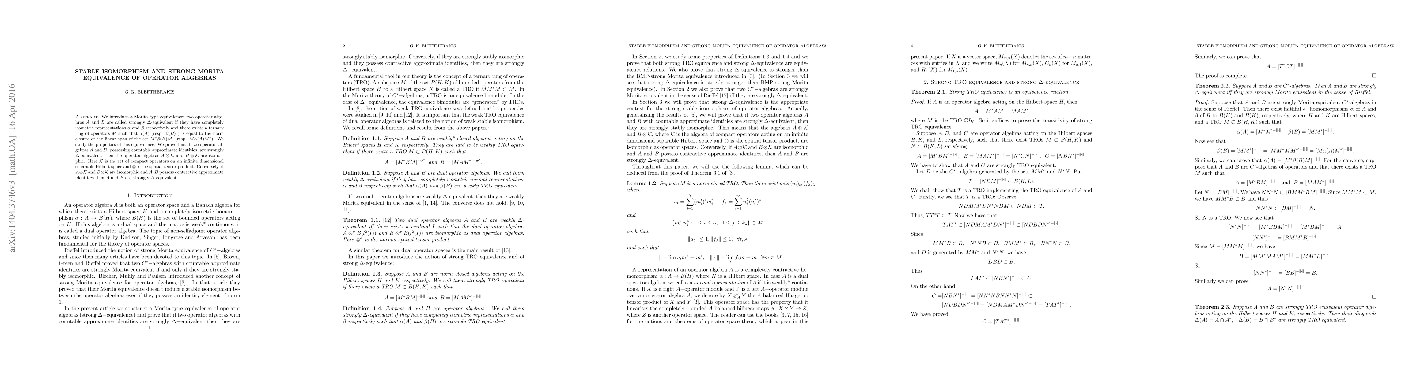 We introduce a Morita type equivalence: two operator algebras $A$ and $B$ are called strongly $\Delta $-equivalent if they have completely isometric representations $\alpha $ and $\beta $ respectively and there exists a ternary ring of operators $M$ such that $\alpha (A)$ (resp. $\beta (B)$) is equal to the norm closure of the linear span of the set $M^*\beta (B)M, $ (resp. $M\alpha (A)M^*$). We study the properties of this equivalence. We prove that if two operator algebras $A$ and $B,$ possessing countable approximate identities, are strongly $\Delta $-equivalent, then the operator algebras $A\otimes \cl K$ and $B\otimes \cl K$ are isomorphic. Here $\cl K$ is the set of compact operators on an infinite dimensional separable Hilbert space and $\otimes $ is the spatial tensor product. Conversely, if $A\otimes \cl K$ and $B\otimes \cl K$ are isomorphic and $A, B$ possess contractive approximate identities then $A$ and $B$ are strongly $\Delta $-equivalent.