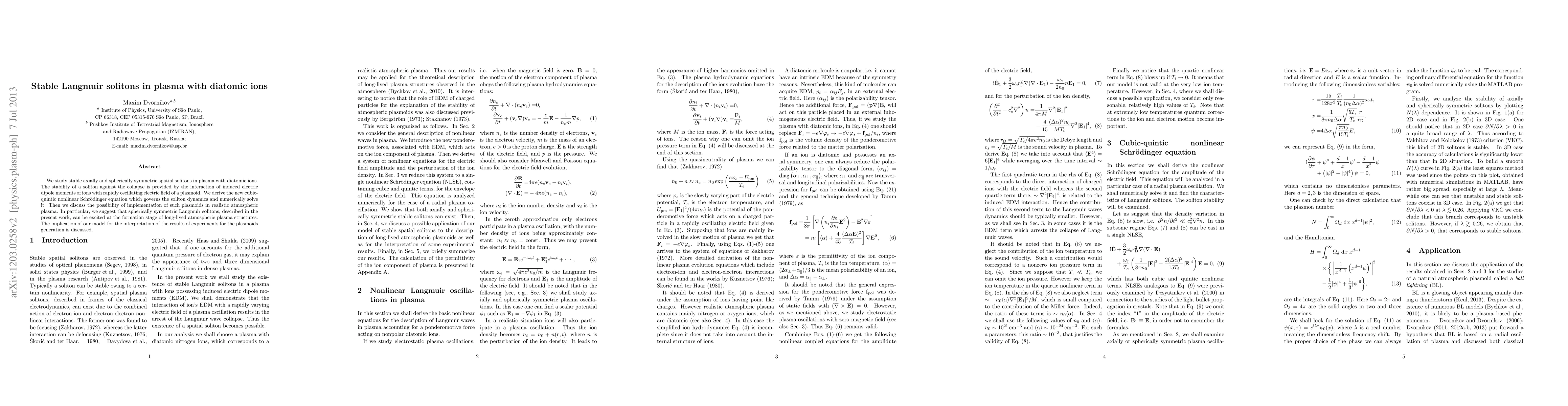 We study stable axially and spherically symmetric spatial solitons in plasma with diatomic ions. The stability of a soliton against the collapse is provided by the interaction of induced electric dipole moments of ions with rapidly oscillating electric field of a plasmoid. We derive the new cubic-quintic nonlinear Schrodinger equation which governs the soliton dynamics and numerically solve it. Then we discuss the possibility of implementation of such plasmoids in realistic atmospheric plasma. In particular, we suggest that spherically symmetric Langmuir solitons, described in the present work, can be excited at the formation stage of long-lived atmospheric plasma structures. The implication of our model for the interpretation of the results of experiments for the plasmoids generation is discussed.