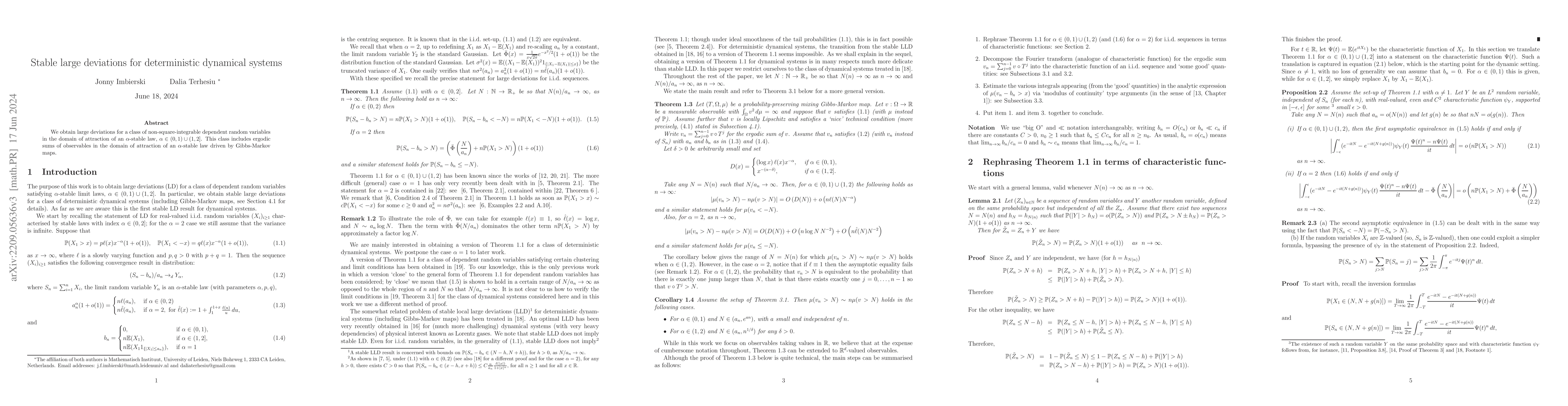 We obtain large deviations for a class of dependent random variables in the domain of attraction of an $\alpha$-stable law, $\alpha\in (0, 1)\cup (1, 2]$. This class includes ergodic sums of observables in the domain of attraction of an $\alpha$-stable law driven by Gibbs-Markov maps.