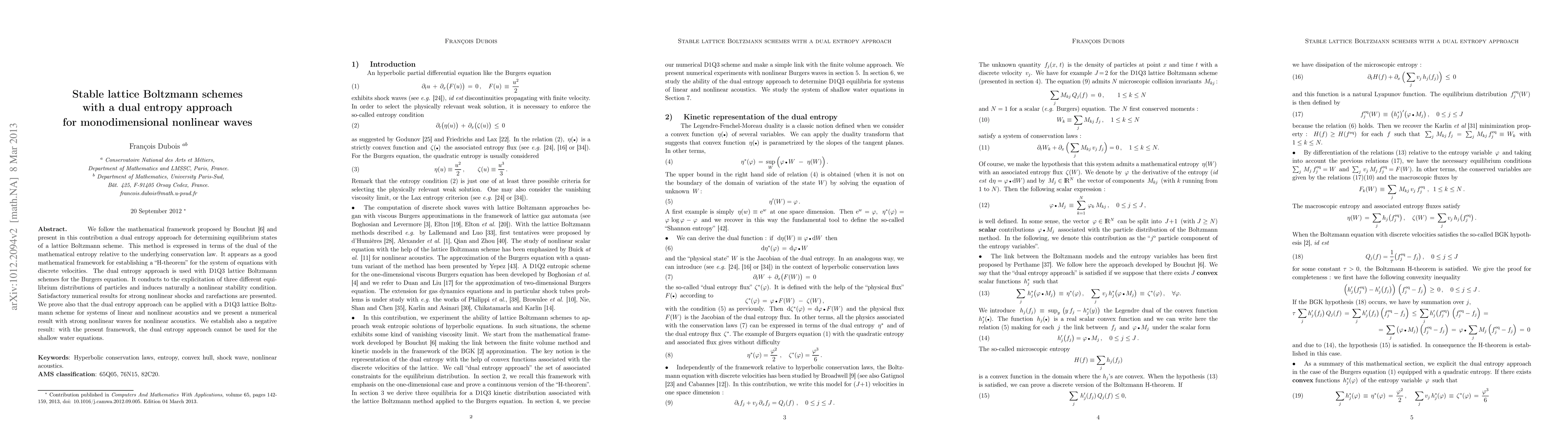 This paper introduces a dual entropy approach for lattice Boltzmann schemes to determine equilibrium states, particularly for D1Q3 schemes applied to the Burgers equation and nonlinear acoustics, leading to satisfactory numerical results for nonlinear waves. However, the method does not apply to the shallow water equations.
