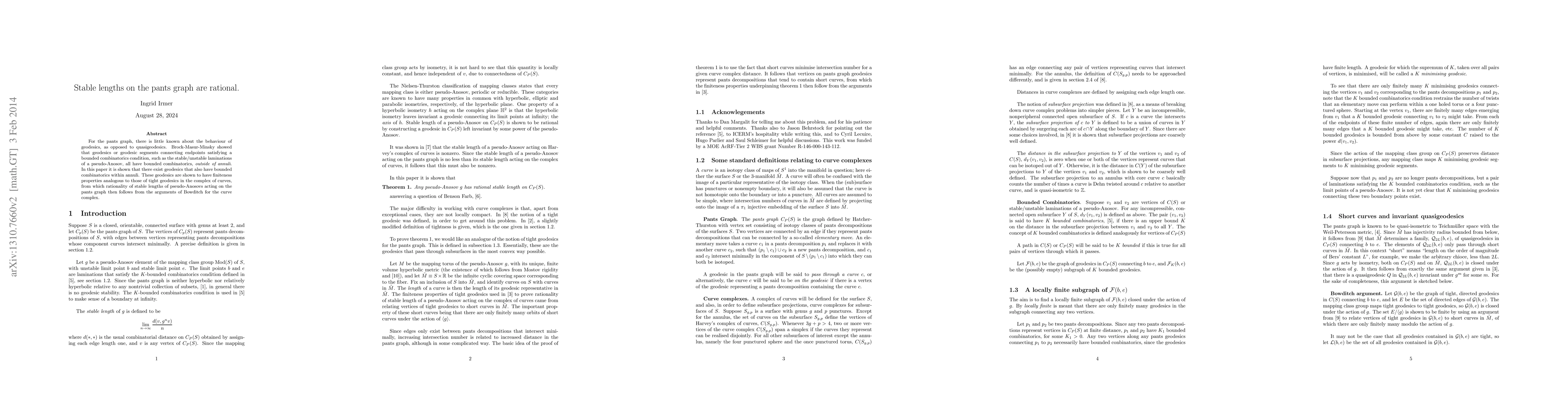 This paper demonstrates that geodesics on the pants graph, which connect endpoints with specific bounded combinatorial conditions, exhibit rationality of stable lengths. It extends previous results by showing that geodesics maintain bounded combinatorics even within annuli, leading to the conclusion through Bowditch's arguments.