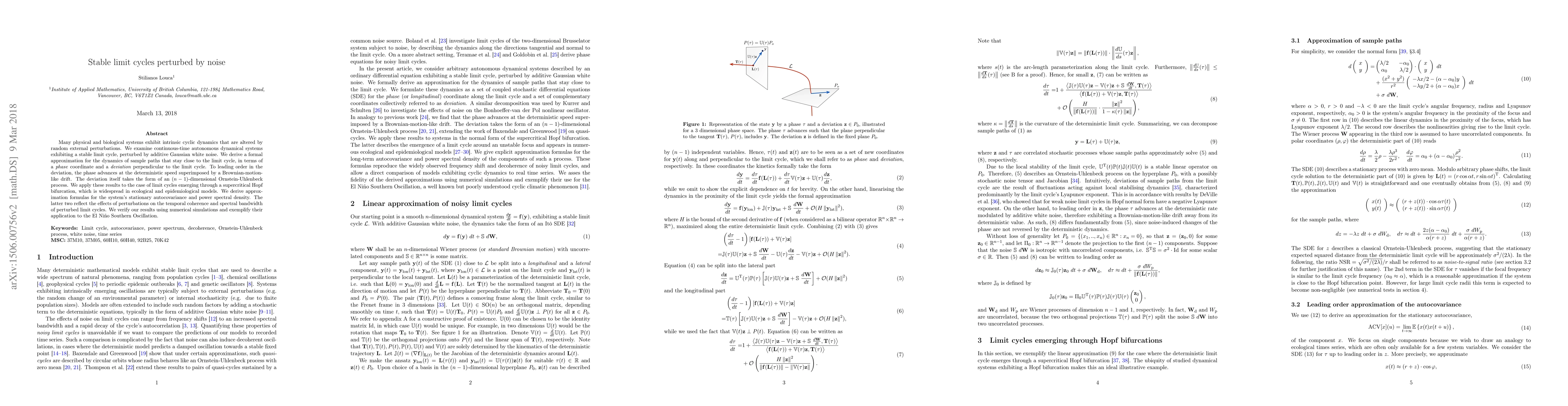 This paper studies the impact of additive Gaussian white noise on stable limit cycles in dynamical systems, deriving approximations for perturbed dynamics and applying these to systems with supercritical Hopf bifurcations. It provides formulas for stationary autocovariance and spectral density, validated through simulations and exemplified in the context of the El Niño Southern Oscillation.