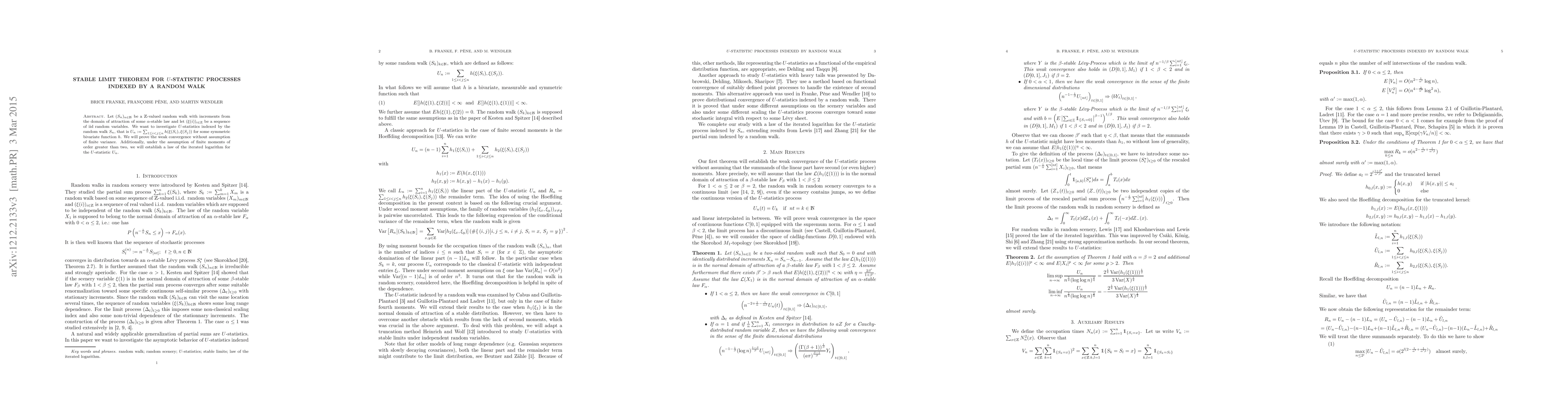 This paper investigates U-statistics indexed by a Z-valued random walk with increments from the domain of attraction of an α-stable law. It proves the weak convergence of these U-statistics without requiring finite variance and establishes a law of the iterated logarithm under the assumption of finite moments of order greater than two.