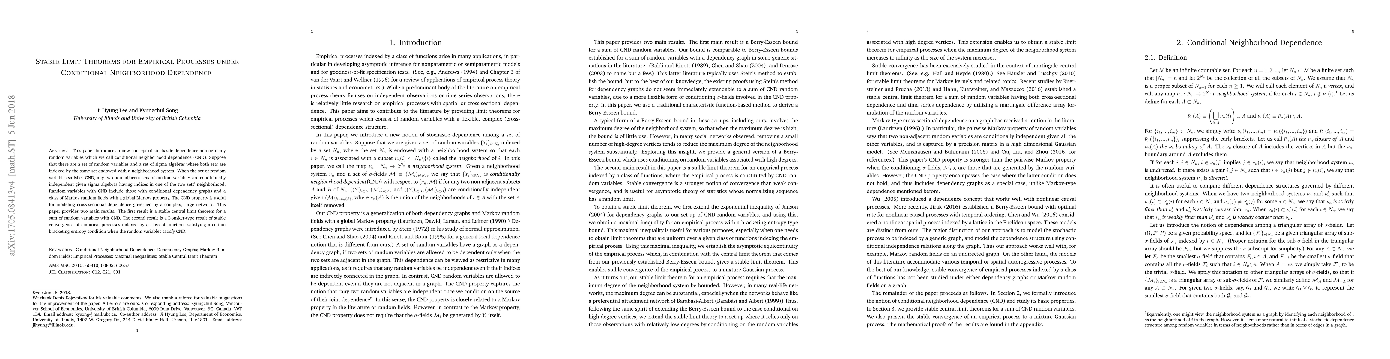 This paper introduces a new concept of stochastic dependence among many random variables which we call conditional neighborhood dependence (CND). Suppose that there are a set of random variables and a set of sigma algebras where both sets are indexed by the same set endowed with a neighborhood system. When the set of random variables satisfies CND, any two non-adjacent sets of random variables are conditionally independent given sigma algebras having indices in one of the two sets' neighborhood. Random variables with CND include those with conditional dependency graphs and a class of Markov random fields with a global Markov property. The CND property is useful for modeling cross-sectional dependence governed by a complex, large network. This paper provides two main results. The first result is a stable central limit theorem for a sum of random variables with CND. The second result is a Donsker-type result of stable convergence of empirical processes indexed by a class of functions satisfying a certain bracketing entropy condition when the random variables satisfy CND.