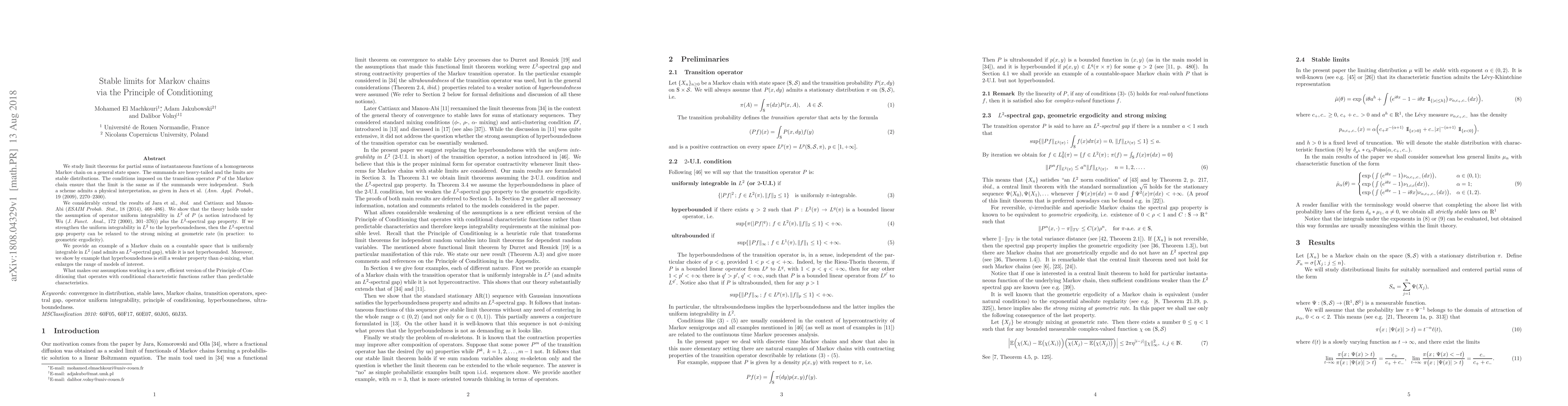 We study limit theorems for partial sums of instantaneous functions of a homogeneous Markov chain on a general state space. The summands are heavy-tailed and the limits are stable distributions. The conditions imposed on the transition operator $P$ of the Markov chain ensure that the limit is the same as if the summands were independent. Such a~scheme admits a physical interpretation, as given in Jara et al. (Ann. Appl. Probab., 19 (2009), 2270--2300). We considerably extend the results of Jara et al., (ibid.) and Cattiaux and Manou-Abi (ESAIM Probab. Stat., 18 (2014), 468--486). We show that the theory holds under the assumption of operator uniform integrability in $L^2$ of $P$ (a notion introduced by Wu (J. Funct. Anal., 172 (2000), 301--376)) plus the $L^2$-spectral gap property. If we strengthen the uniform integrability in $L^2$ to the hyperboundedness, then the $L^2$-spectral gap property can be relaxed to the strong mixing at geometric rate (in practice: to geometric ergodicity). We provide an example of a Markov chain on a countable space that is uniformly integrable in $L^2$ (and admits an $L^2$-spectral gap), while it is not hyperbounded. Moreover, we show by example that hyperboundedness is still a weaker property than $\phi$-mixing, what enlarges the range of models of interest. What makes our assumptions working is a new, efficient version of the Principle of Conditioning that operates with conditional characteristic functions rather than predictable characteristics.