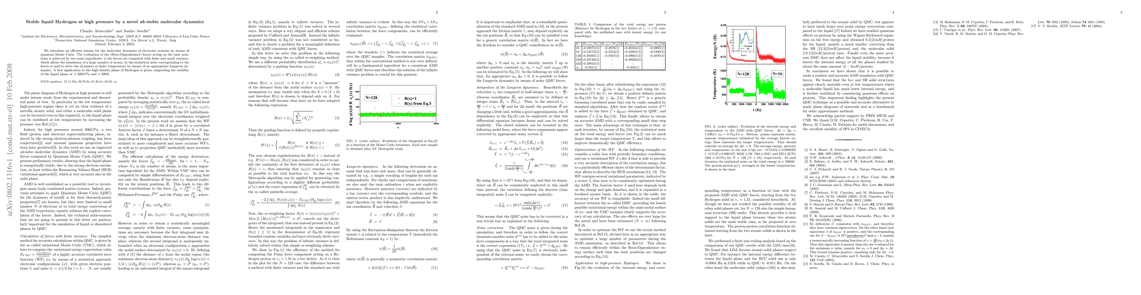 This paper presents a novel ab-initio molecular dynamics method using quantum Monte Carlo to simulate electronic systems, achieving stable liquid hydrogen at high pressure (around 300GPa and 400K) by efficiently computing forces with minimal variance and employing Langevin dynamics to manage statistical noise.
