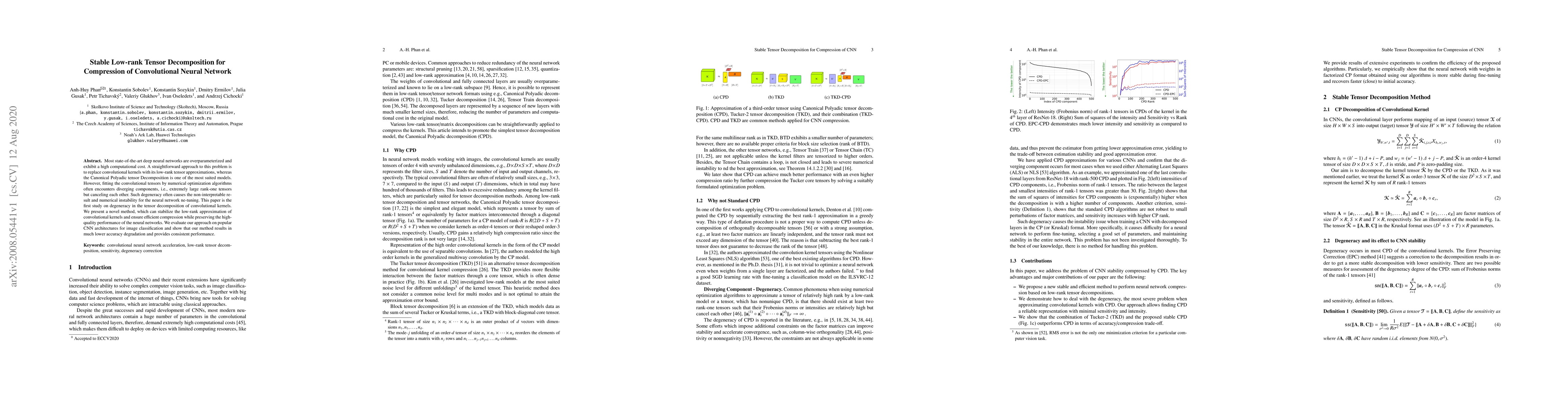 This paper introduces a novel method to stabilize low-rank tensor decomposition for compressing convolutional neural networks, addressing the issue of diverging components in tensor approximations. The proposed approach ensures efficient compression and maintains high-quality performance, demonstrated through lower accuracy degradation in popular CNN architectures.