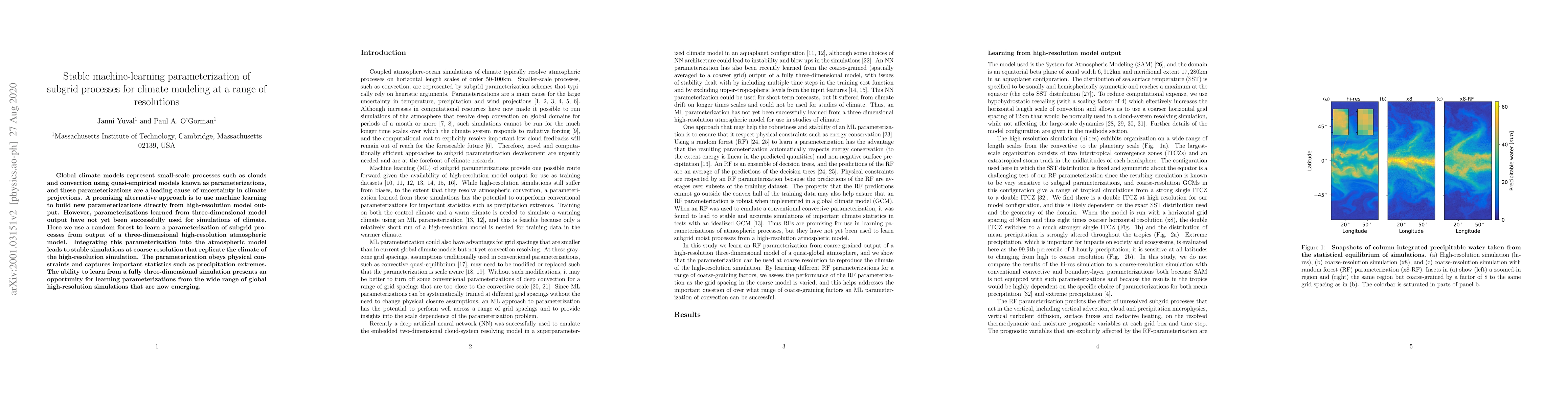 This paper proposes a machine learning-based parameterization of subgrid processes using a random forest, trained on high-resolution atmospheric model output, which successfully stabilizes climate simulations at coarse resolutions while maintaining physical constraints and capturing precipitation extremes. This approach offers potential for future climate modeling advancements.