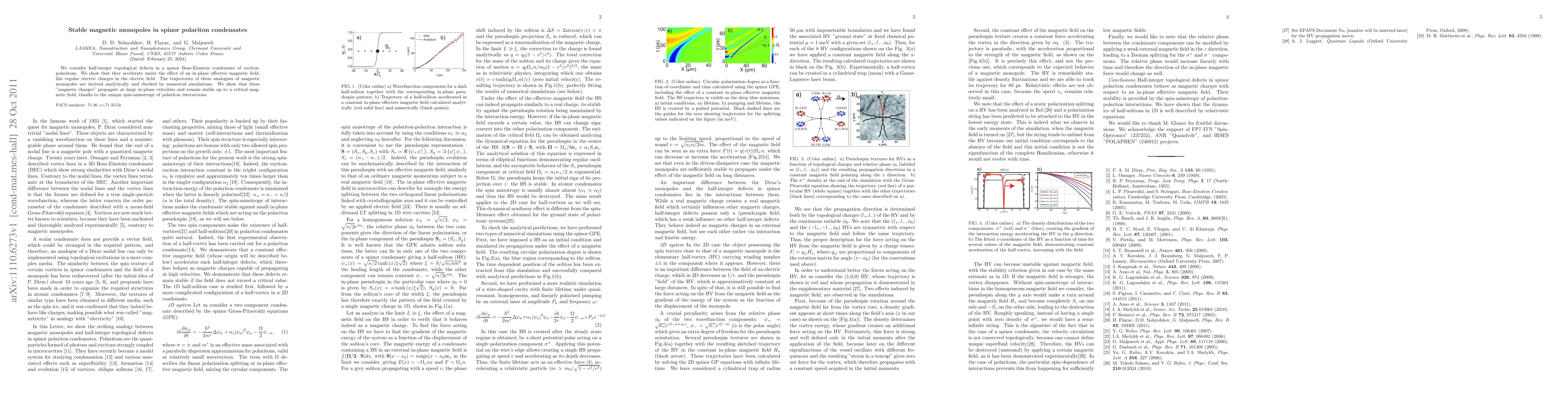 This paper investigates half-integer topological defects in spinor polariton condensates, demonstrating their behavior akin to magnetic monopoles under an effective magnetic field. The stability and propagation of these defects are shown to be maintained by the unique spin-anisotropy of polariton interactions.