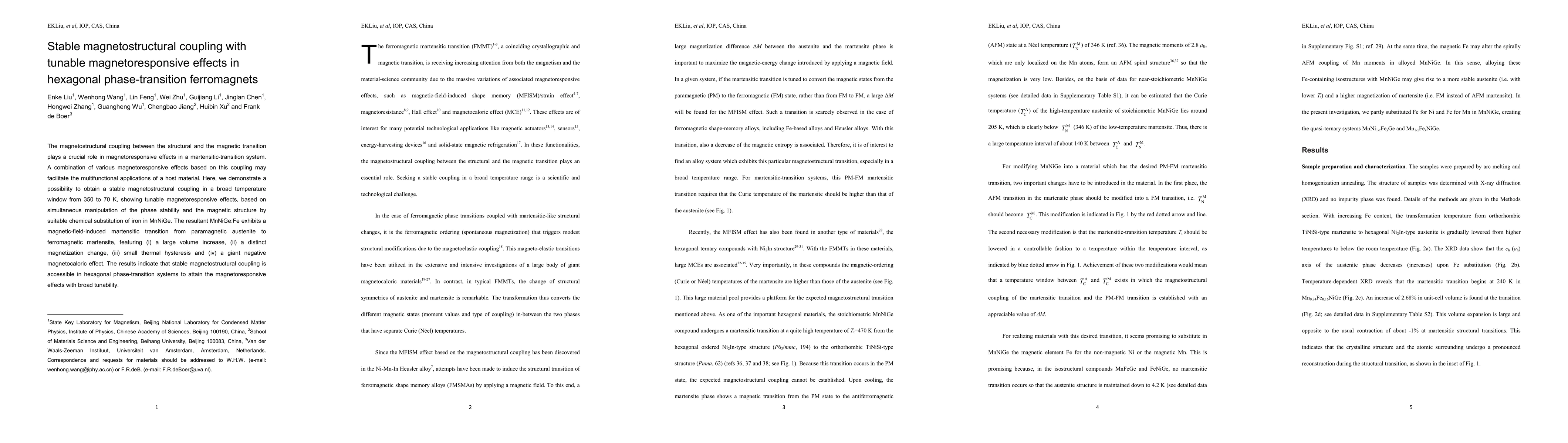 This paper demonstrates stable magnetostructural coupling in hexagonal phase-transition ferromagnets, specifically MnNiGe:Fe, showing tunable magnetoresponsive effects over a broad temperature range. The study highlights a magnetic-field-induced martensitic transition with significant volume increase, magnetization change, minimal thermal hysteresis, and a giant negative magnetocaloric effect, indicating potential for multifunctional applications.