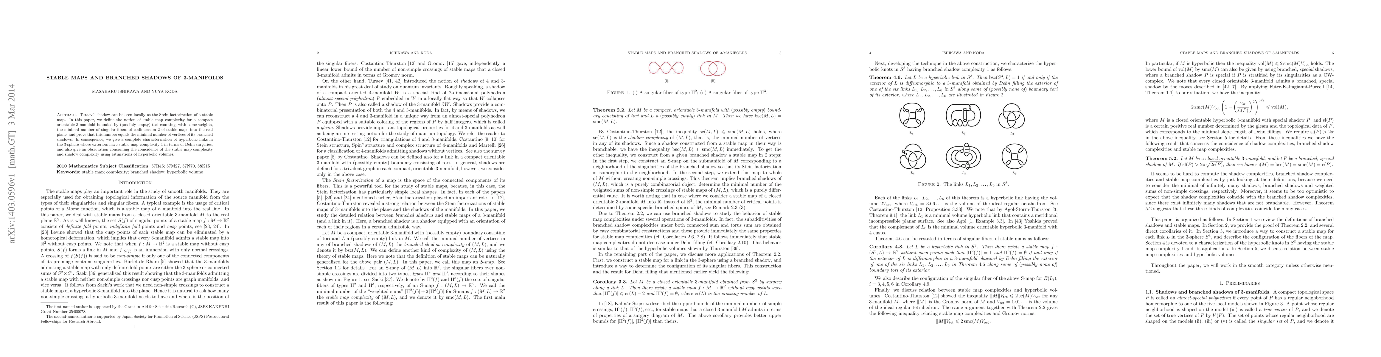 This paper introduces stable map complexity for 3-manifolds, showing it equals the minimal number of vertices in their branched shadows. It characterizes hyperbolic links in the 3-sphere with stable map complexity 1 via Dehn surgeries and observes the equivalence of stable map and shadow complexities through hyperbolic volume estimations.