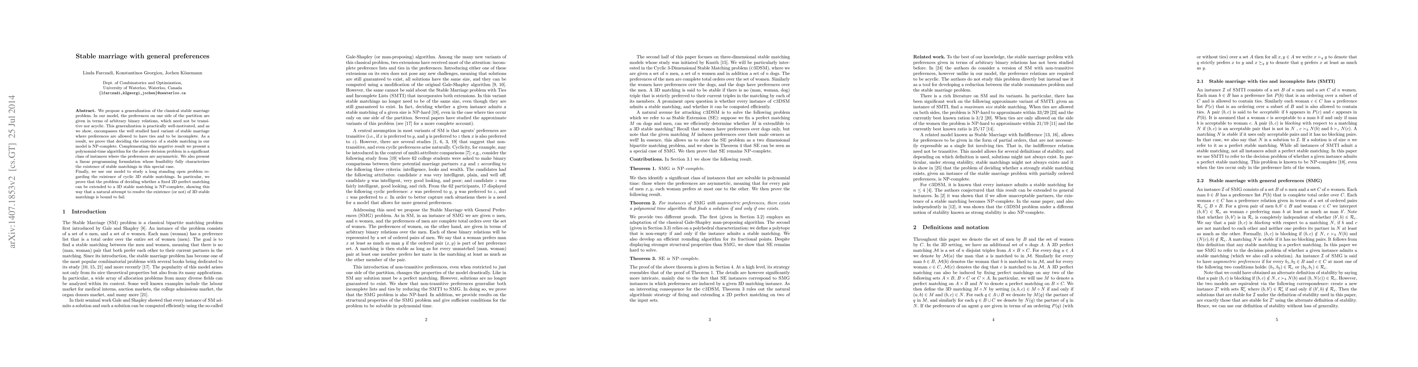This paper generalizes the stable marriage problem to allow arbitrary binary relations on one side, proving NP-completeness for the decision problem. It also presents a polynomial-time algorithm for stable matchings when preferences are asymmetric, along with a linear programming formulation for this special case.