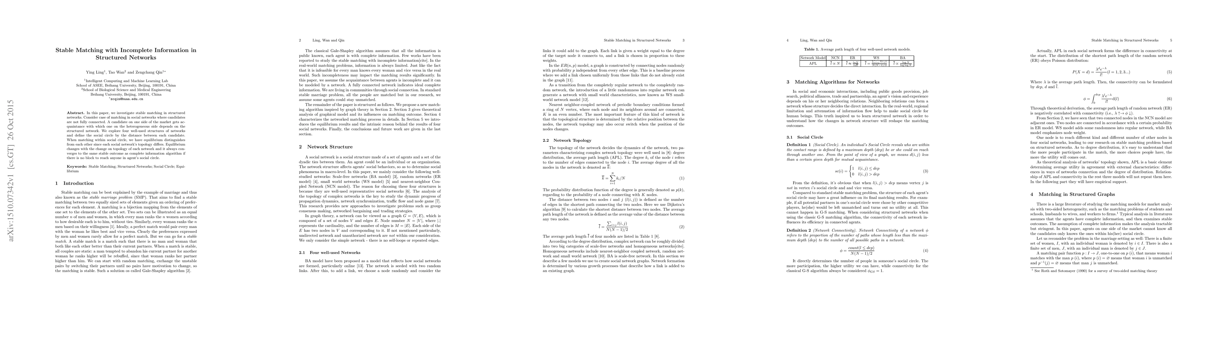 This work proposes a new stable matching algorithm for structured networks with incomplete information, which has potential applications in various fields.
