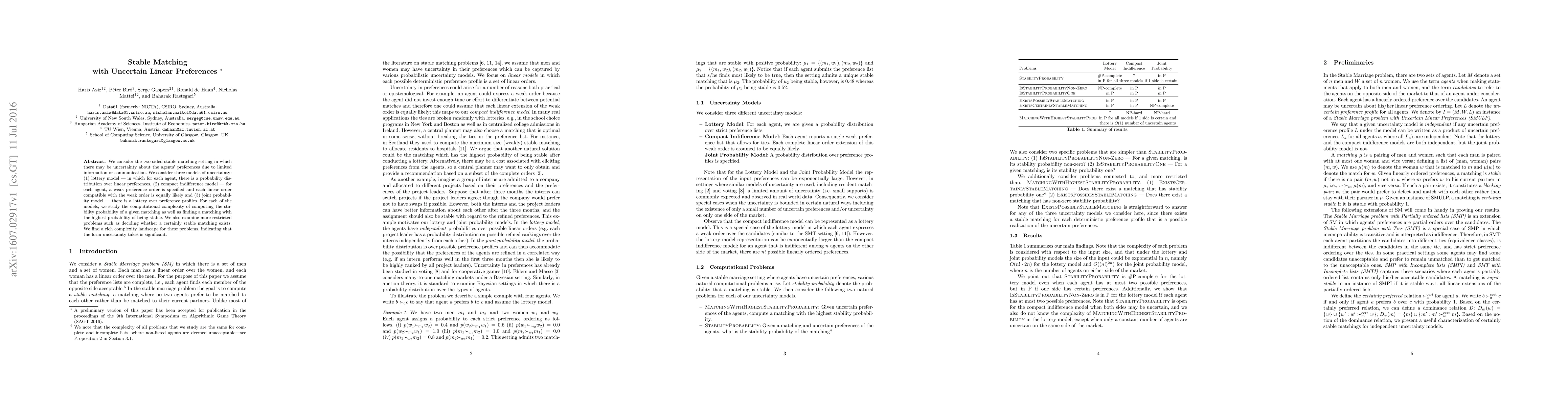 This paper explores stable matching scenarios with uncertain linear preferences under three models: lottery, compact indifference, and joint probability. It investigates the computational complexity of determining stability probabilities and finding the most likely stable matchings, revealing a complex landscape influenced by the nature of uncertainty.