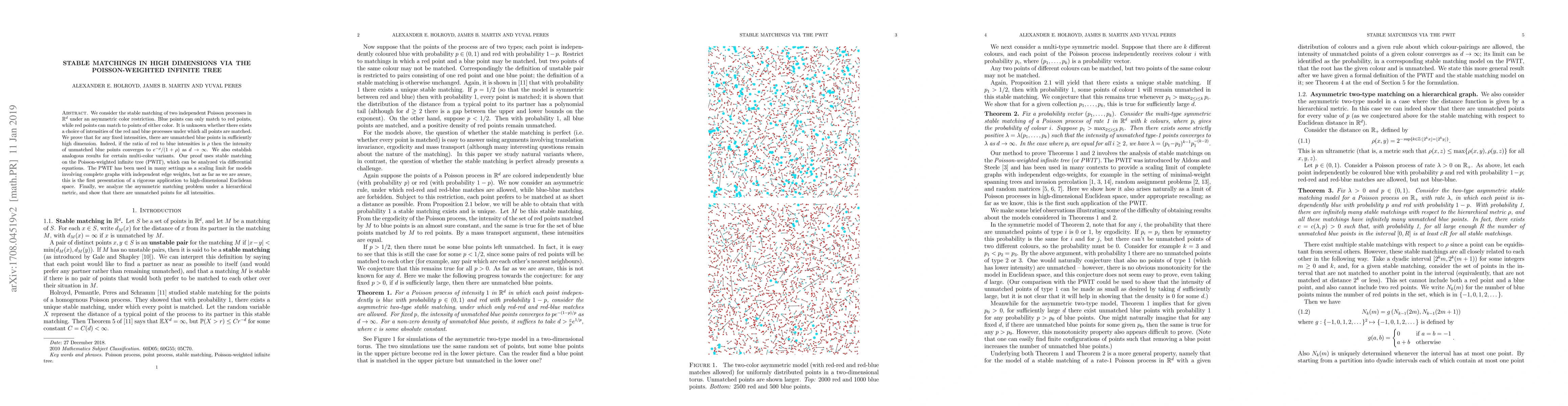 We consider the stable matching of two independent Poisson processes in $\mathbb{R}^d$ under an asymmetric color restriction. Blue points can only match to red points, while red points can match to points of either color. It is unknown whether there exists a choice of intensities of the red and blue processes under which all points are matched. We prove that for any fixed intensities, there are unmatched blue points in sufficiently high dimension. Indeed, if the ratio of red to blue intensities is $\rho$ then the intensity of unmatched blue points converges to $e^{-\rho}/(1+\rho)$ as $d\to\infty$. We also establish analogous results for certain multi-color variants. Our proof uses stable matching on the Poisson-weighted infinite tree (PWIT), which can be analyzed via differential equations. The PWIT has been used in many settings as a scaling limit for models involving complete graphs with independent edge weights, but we believe that this is the first rigorous application to high-dimensional Euclidean space. Finally, we analyze the asymmetric matching problem under a hierarchical metric, and show that there are unmatched points for all intensities.