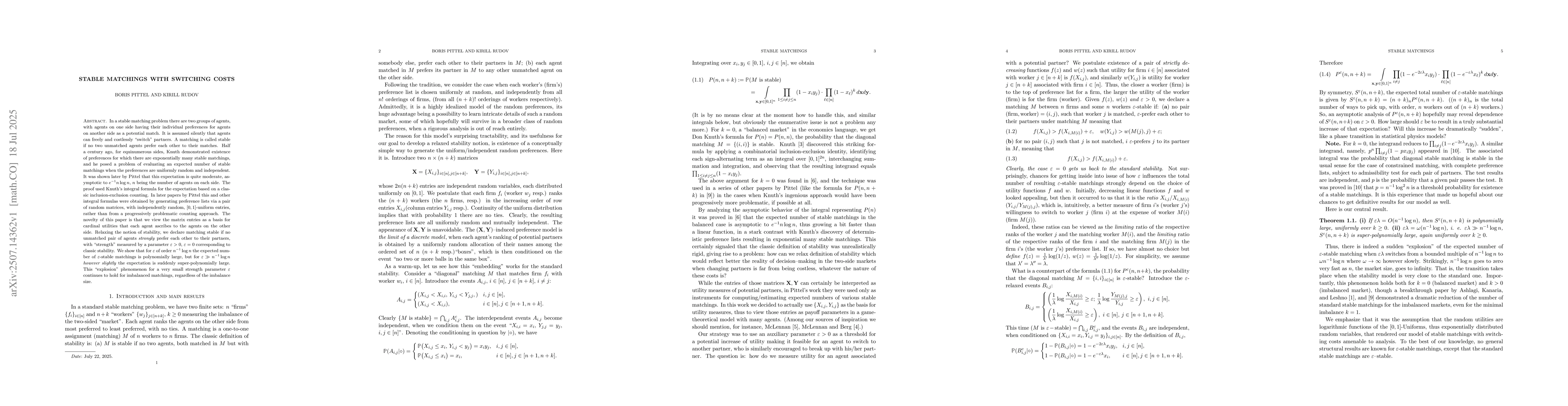 In a stable matching problem there are two groups of agents, with agents on one side having their individual preferences for agents on another side as a potential match. It is assumed silently that agents can freely and costlessly ``switch" partners. A matching is called stable if no two unmatched agents prefer each other to their matches. Half a century ago, for equinumerous sides, Knuth demonstrated existence of preferences for which there are exponentially many stable matchings, and he posed a problem of evaluating an expected number of stable matchings when the preferences are uniformly random and independent. It was shown later by Pittel that this expectation is quite moderate, asymptotic to $e^{-1}n\log n$, $n$ being the number of agents on each side. The proof used Knuth's integral formula for the expectation based on a classic inclusion-exclusion counting. In later papers by Pittel this and other integral formulas were obtained by generating preference lists via a pair of random matrices, with independently random, $[0,1]$-uniform entries, rather than from a progressively problematic counting approach. The novelty of this paper is that we view the matrix entries as a basis for cardinal utilities that each agent ascribes to the agents on the other side. Relaxing the notion of stability, we declare matching stable if no unmatched pair of agents {\it strongly\/} prefer each other to their partners, with ``strength'' measured by a parameter $\eps>0$, $\eps=0$ corresponding to classic stability. We show that for $\eps$ of order $n^{-1}\log n$ the expected number of $\eps$-stable matchings is polynomially large, but for $\eps\gg n^{-1}\log n$ {\it however slightly\/} the expectation is suddenly super-polynomially large. This ``explosion'' phenomenon for a very small strength parameter $\eps$ continues to hold for imbalanced matchings, regardless of the imbalance size.