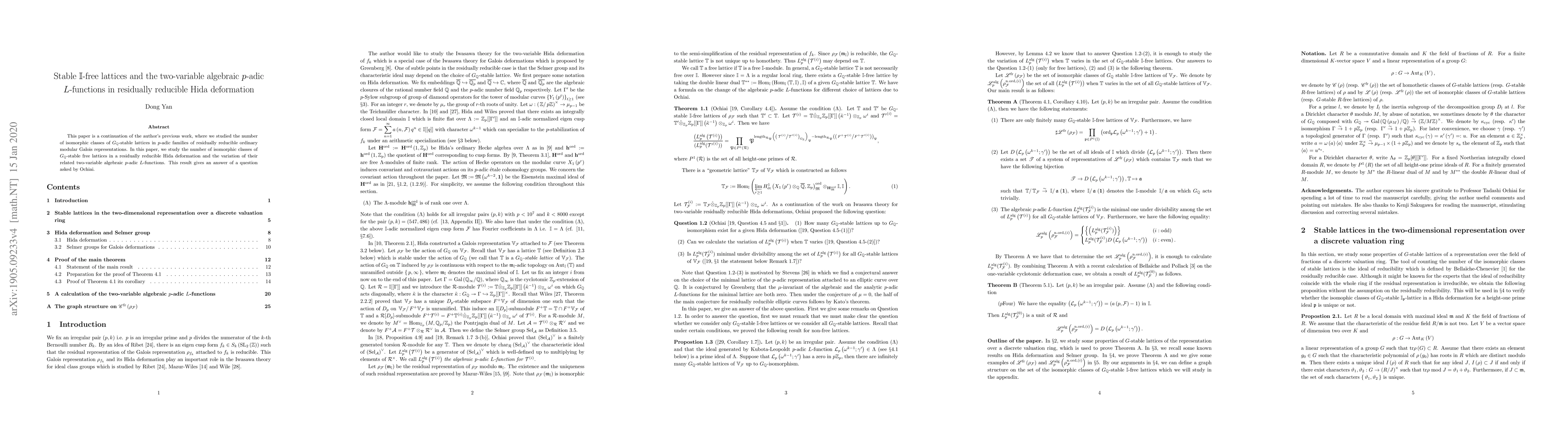 This paper investigates the number of isomorphic classes of $G_{\mathbb{Q}}$-stable free lattices in residually reducible Hida deformations, and examines the variation of their associated two-variable algebraic $p$-adic $L$-functions, providing an answer to a question posed by Ochiai.
