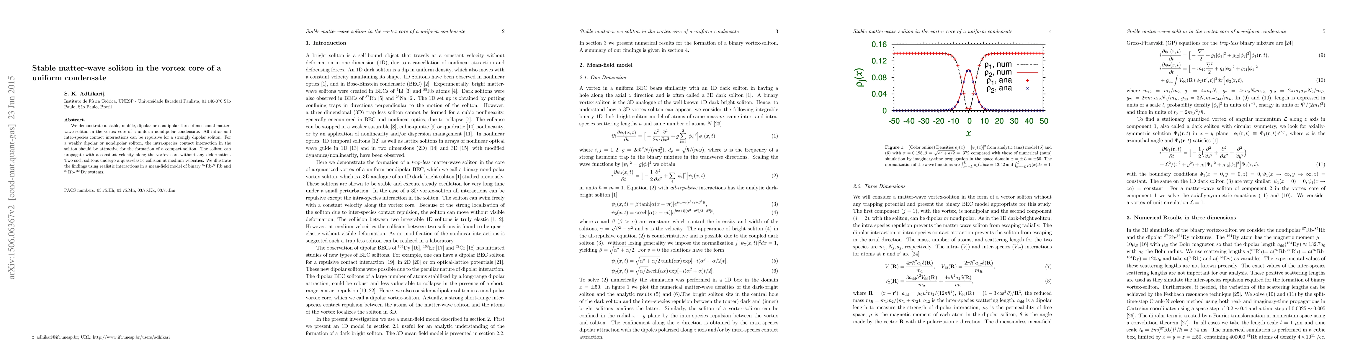 This paper demonstrates stable, mobile matter-wave solitons in the vortex core of uniform condensates, showing that soliton stability depends on the nature of intra-species interactions. The solitons can propagate without deformation and undergo quasi-elastic collisions, illustrated in binary $^{87}$Rb-$^{85}$Rb and $^{87}$Rb-$^{164}$Dy systems.