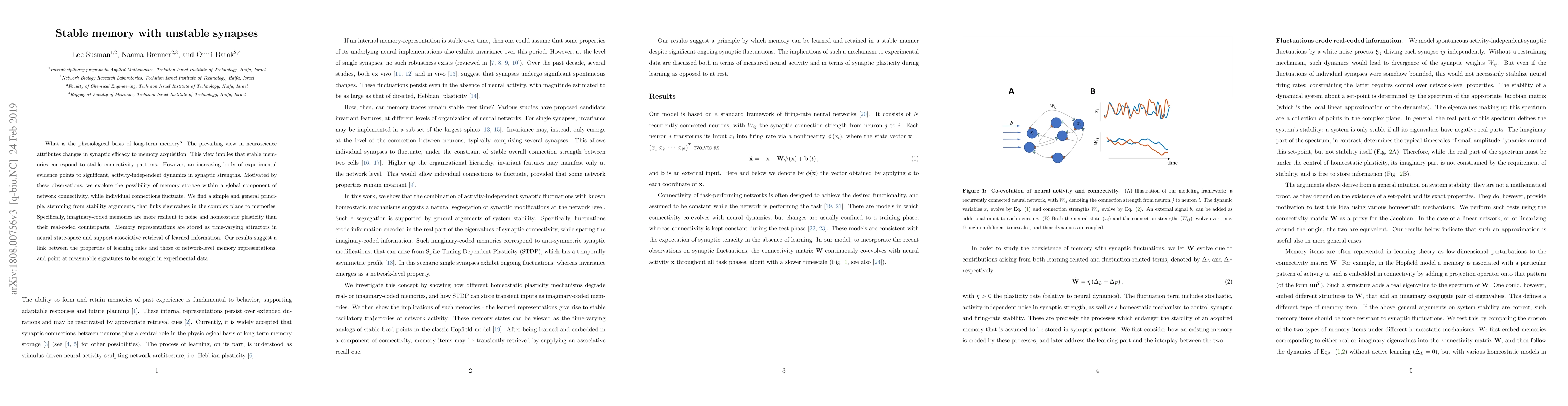 What is the physiological basis of long-term memory? The prevailing view in neuroscience attributes changes in synaptic efficacy to memory acquisition. This view implies that stable memories correspond to stable connectivity patterns. However, an increasing body of experimental evidence points to significant, activity-independent dynamics in synaptic strengths. Motivated by these observations, we explore the possibility of memory storage within a global component of network connectivity, while individual connections fluctuate. We find a simple and general principle, stemming from stability arguments, that links eigenvalues in the complex plane to memories. Specifically, imaginary-coded memories are more resilient to noise and homeostatic plasticity than their real-coded counterparts. Memory representations are stored as time-varying attractors in neural state-space and support associative retrieval of learned information. Our results suggest a link between the properties of learning rules and those of network-level memory representations, and point at measurable signatures to be sought in experimental data.