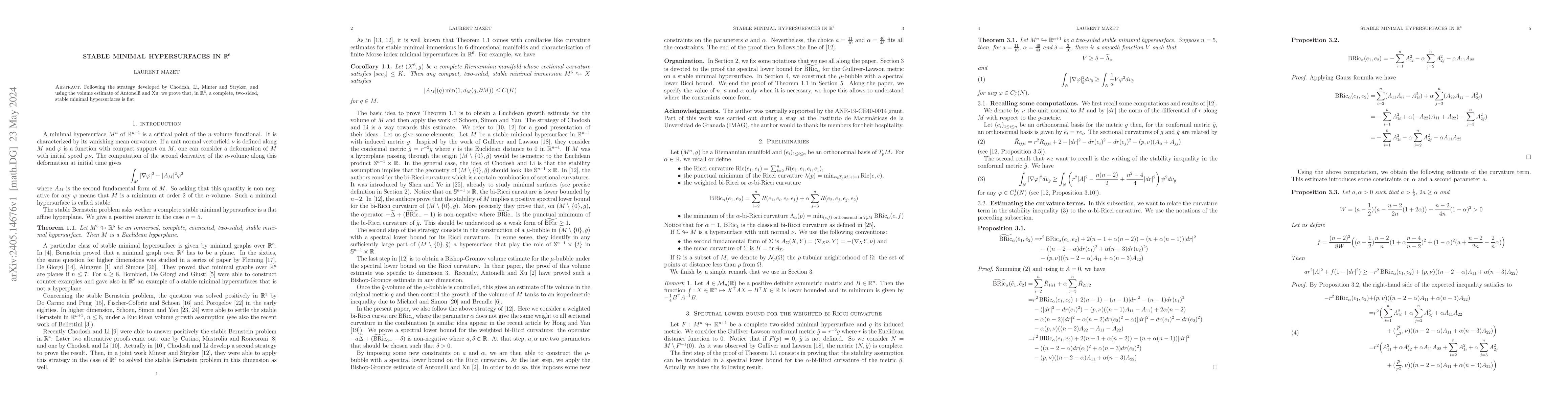 Summary: The paper proves that any complete, two-sided, stable minimal hypersurface in $\mathbb R^6$ is flat, utilizing the strategy of Chodosh et al. and volume estimates from Antonelli and Xu.