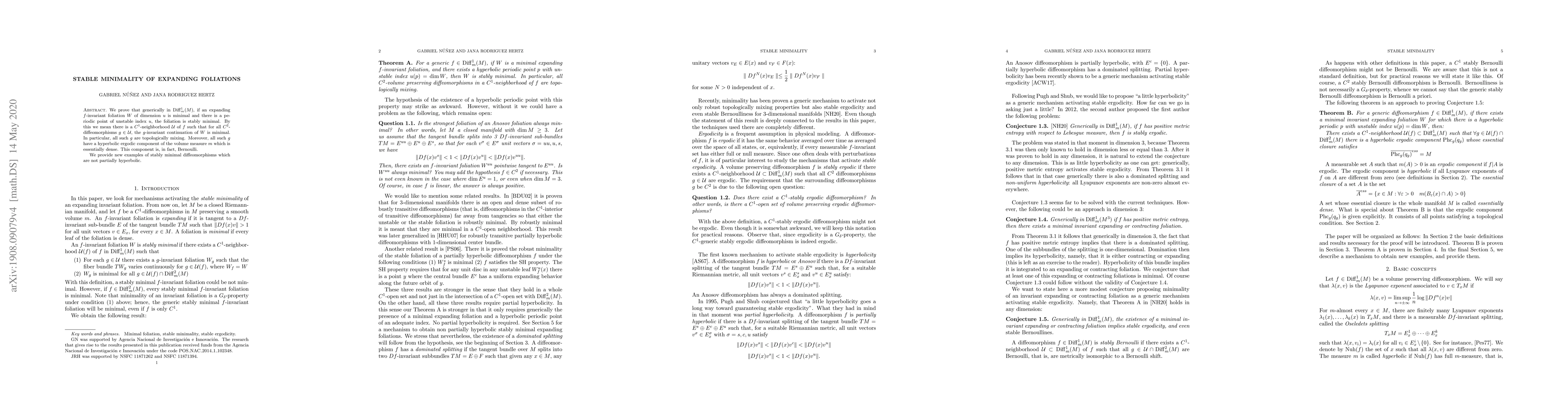 We prove that generically in $\text{Diff}^{1}_{m}(M)$, if an expanding $f$-invariant foliation $W$ of dimension $u$ is minimal and there is a periodic point of unstable index $u$, the foliation is stably minimal. By this we mean there is a $C^{1}$-neighborhood $\mathcal{U}$ of $f$ such that for all $C^{2}$-diffeomorphisms $g\in \mathcal{U}$, the $g$-invariant analytic continuation of $W$ is minimal. In particular, all such $g$ are topologically mixing. Moreover, all such $g$ have a hyperbolic ergodic component of the volume measure $m$ which is essentially dense. This component is, in fact, Bernoulli. We provide new examples of stably minimal diffeomorphisms which are not partially hyperbolic.