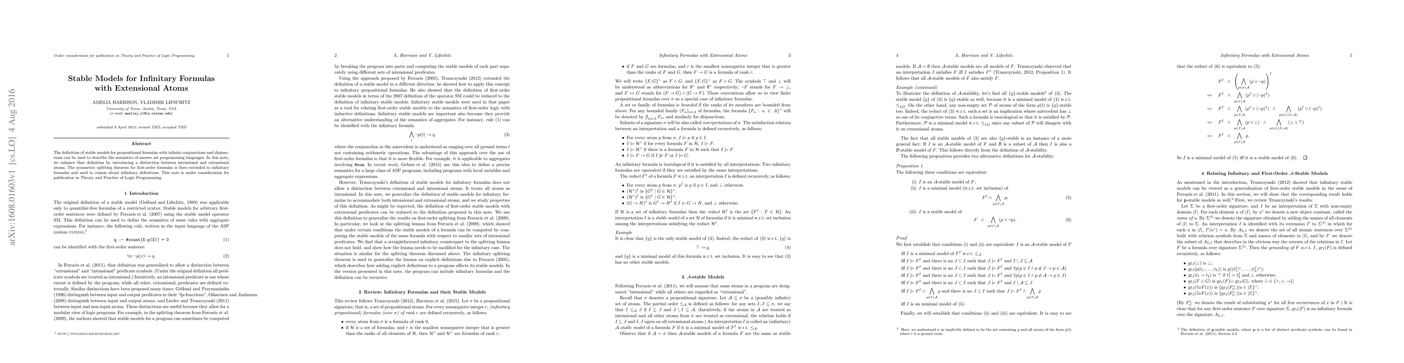 The definition of stable models for propositional formulas with infinite conjunctions and disjunctions can be used to describe the semantics of answer set programming languages. In this note, we enhance that definition by introducing a distinction between intensional and extensional atoms. The symmetric splitting theorem for first-order formulas is then extended to infinitary formulas and used to reason about infinitary definitions. This note is under consideration for publication in Theory and Practice of Logic Programming.
