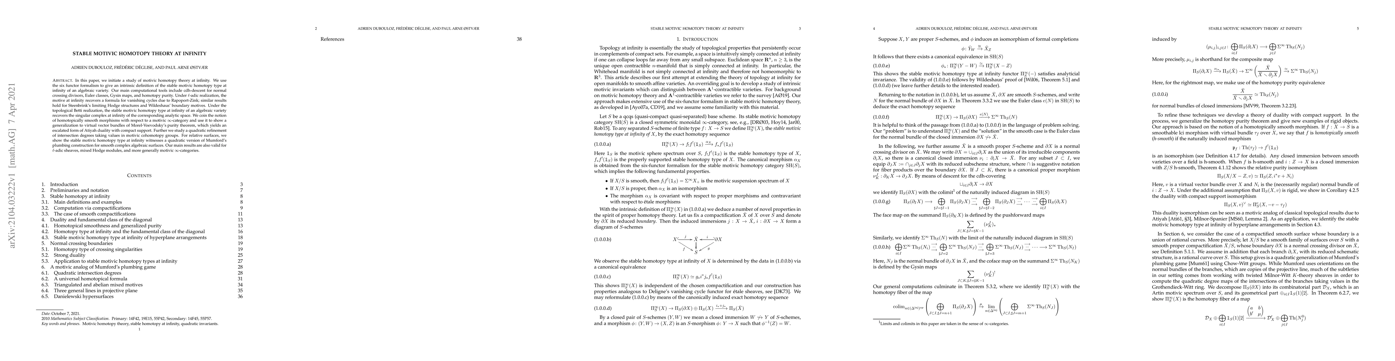 This paper develops stable motivic homotopy theory at infinity, defining stable motivic homotopy types intrinsically using the six functor formalism. It utilizes cdh-descent, Euler classes, Gysin maps, and homotopy purity, showing connections to vanishing cycles, limiting Hodge structures, and boundary motives under $\ell$-adic realization, and to singular complexes under topological Betti realization. The authors also generalize Morel-Voevodsky's purity theorem and explore quadratic refinements in intersection degrees, extending these results to $\ell$-adic sheaves and motivic $\infty$-categories.